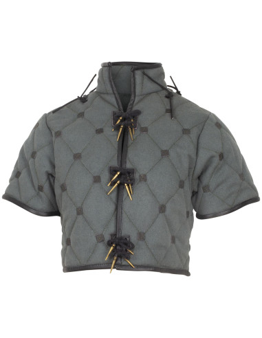 A abertura frontal ajustável por meio de cadarços reforçados em couro, com pontas metálicas, permite adaptar-se ao corpo para maior conforto, além de facilitar sua colocação e remoção. As quatro ilhós metálicos nos ombros facilitam a união com proteção adicional de ombro ou acessórios, adaptando-se a diferentes necessidades de combate e personalização. Complete seu conjunto com a saia Kovira Gambeson para um estilo coeso e funcional.