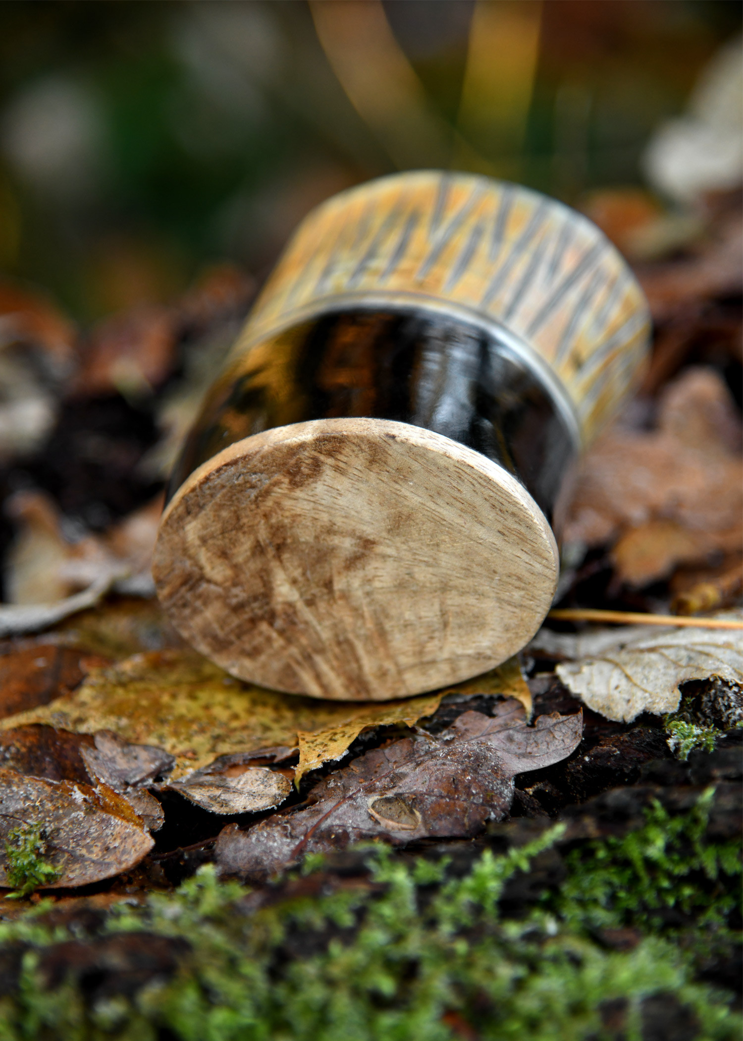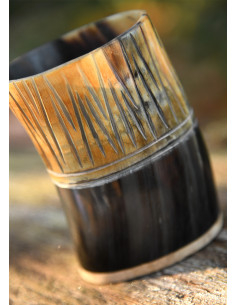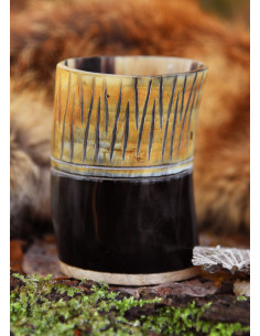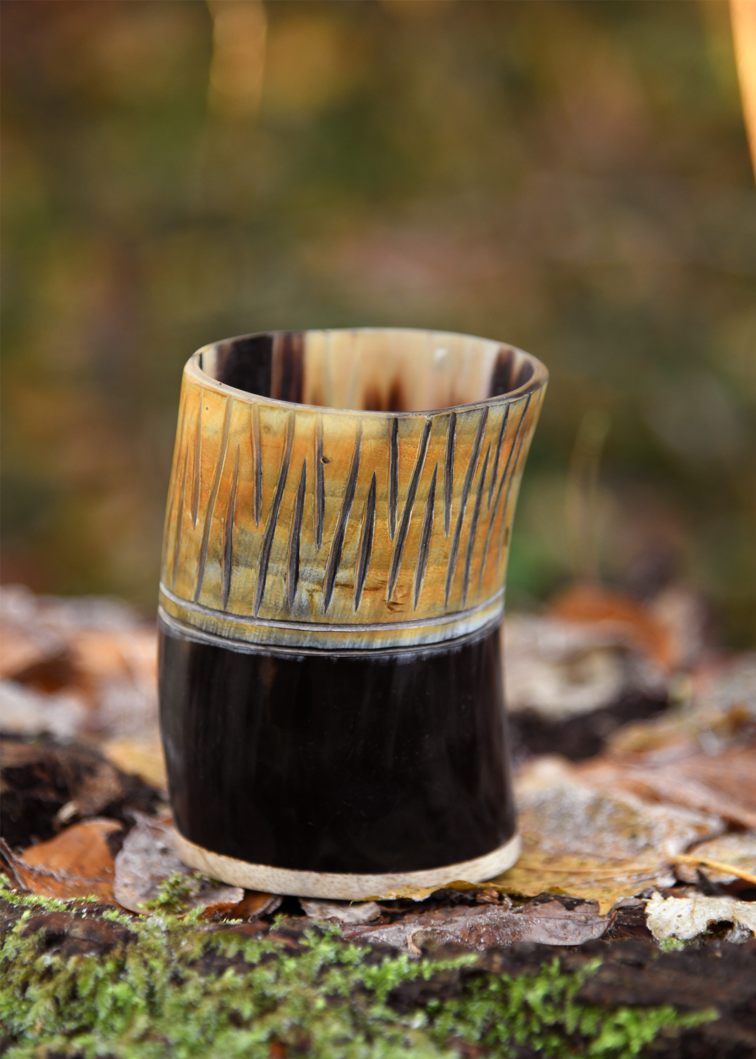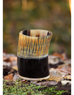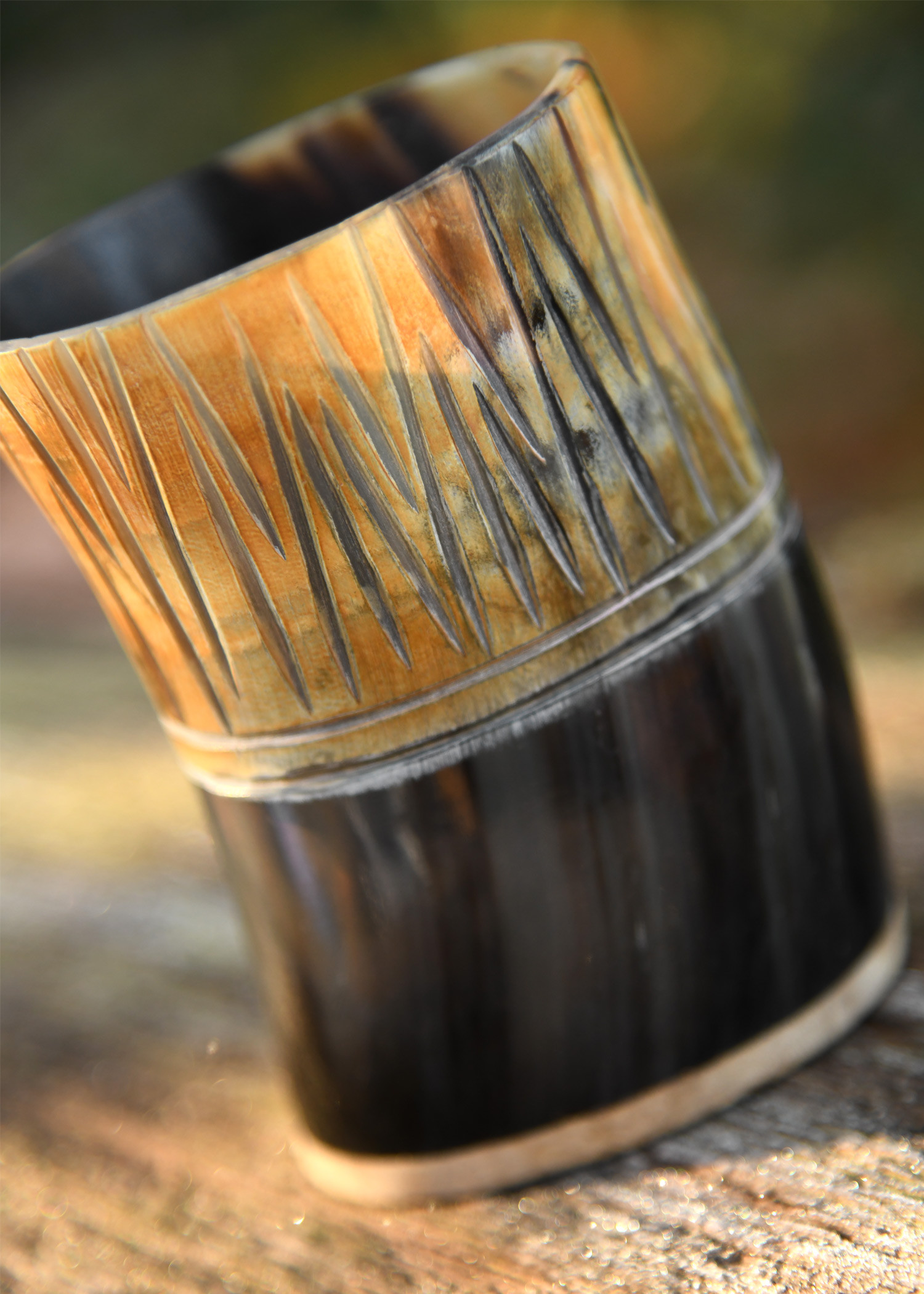 Seu design artesanal, com uma gravação de padrões geométricos em relevo, não só embeleza o copo, mas também reflete a dedicação e a arte da época medieval. Cada peça é única, com variações naturais em cor e forma que a tornam ainda mais especial. Desde um tom negro profundo na base até matizes quentes na parte superior, cada copo conta sua própria história.