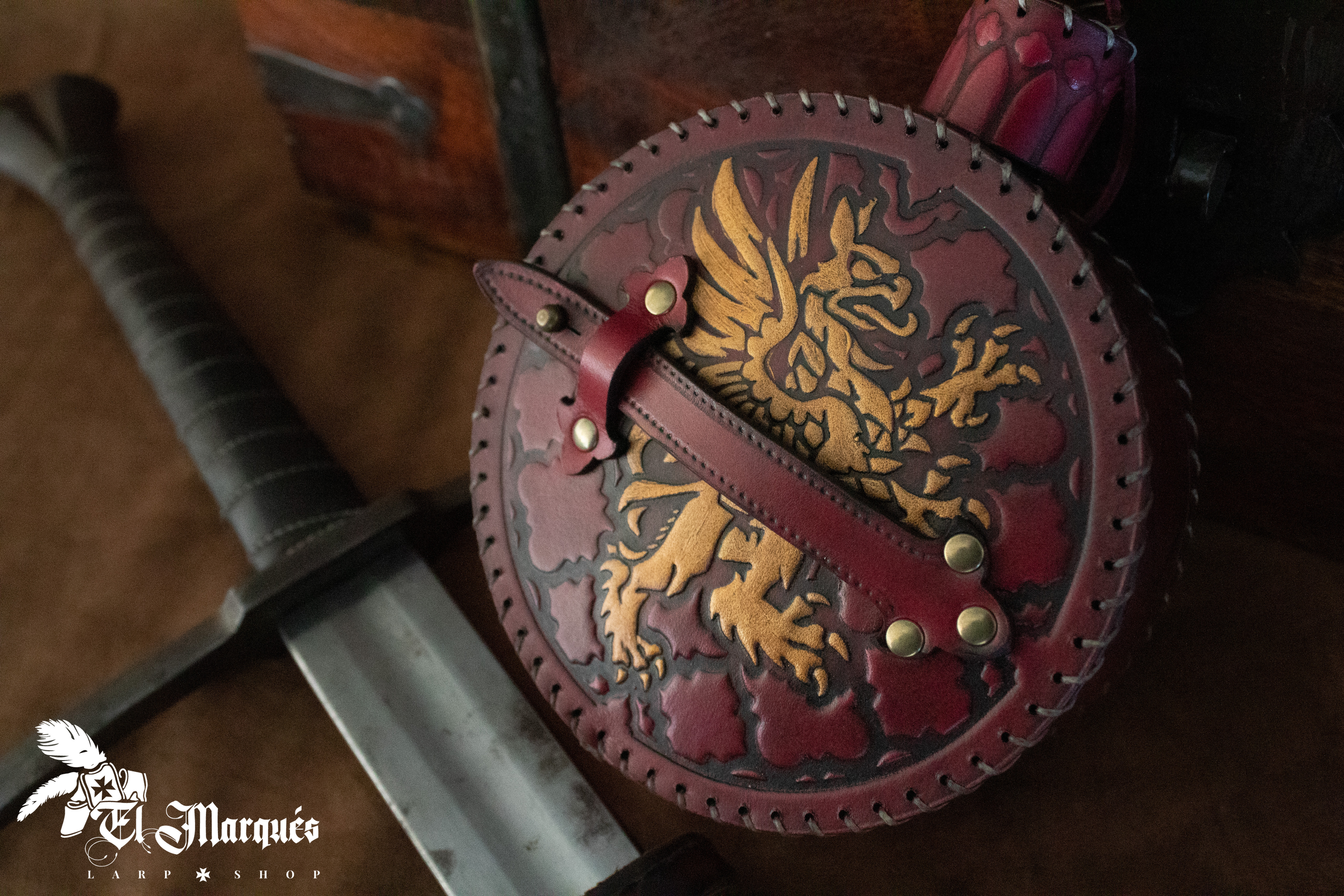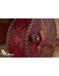 Graças ao seu sistema de ganchos cruzados, você pode fixá-lo confortavelmente a qualquer cinto ou alça, mantendo-o seguro durante os momentos de máxima ação. Além disso, sua alça frontal foi projetada para guardar acessórios essenciais como uma adaga ou uma poção, porque você nunca sabe quando vai precisar deles. O padrão em relevo da superfície não só traz um toque decorativo, mas também melhora a aderência, enquanto os rebites de bronze reforçam sua robustez e dão um toque estético.