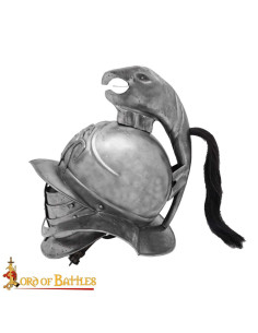 Este design esculpido em aço oferece uma presença imponente que fala de resistência e caráter, graças ao seu acabamento envelhecido que simula as marcas de combate e lhe confere uma aparência autêntica e dramática. A crista em forma de águia e o relevo frontal conferem aquele selo simbólico de poder e desafio, tornando o capacete uma peça que atrai olhares e desperta histórias.
