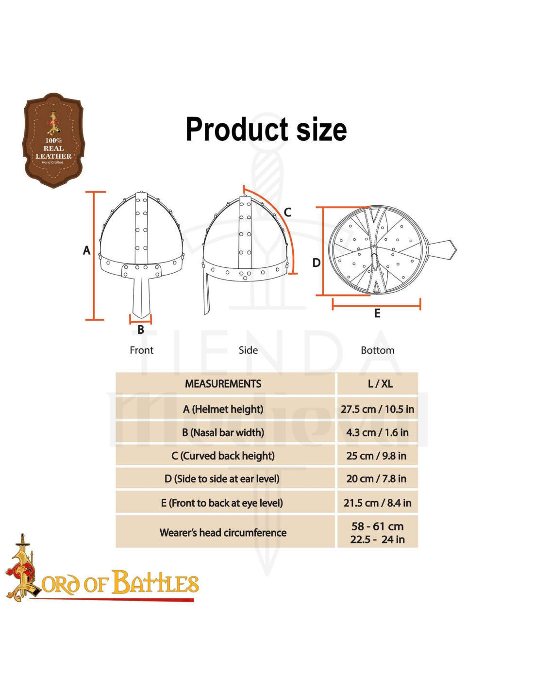 Com um peso aproximado de 2,5 kg, este capacete é resistente, mas manejável, ideal para cosplay, reconstituição histórica ou colecionismo. Inspirado no período da conquista normanda do século XI, seu acabamento prateado e detalhes de rebites fazem dele uma peça autêntica que se destaca em qualquer exposição. Além disso, a marca 'Lord of Battles' garante a qualidade e fidelidade à história.