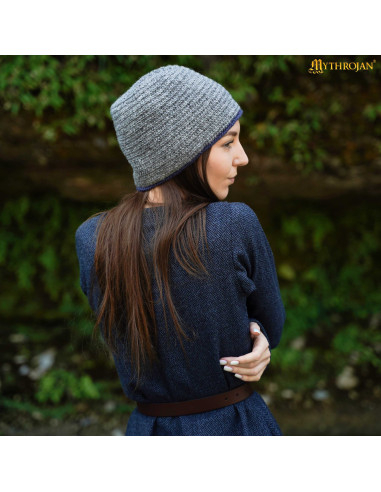 Gorro medieval nórdico em lã modelo Naalbinding, cinza-azul
