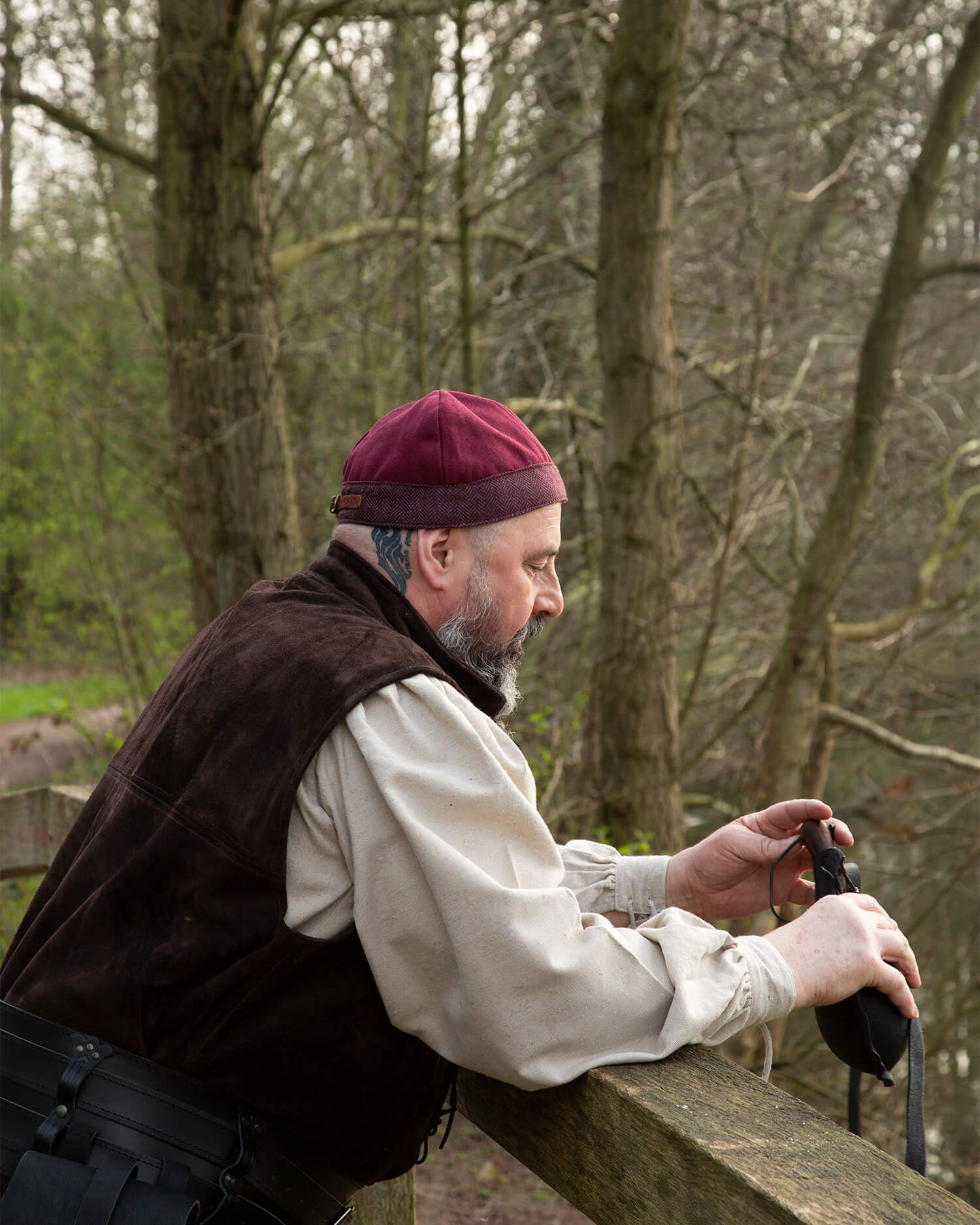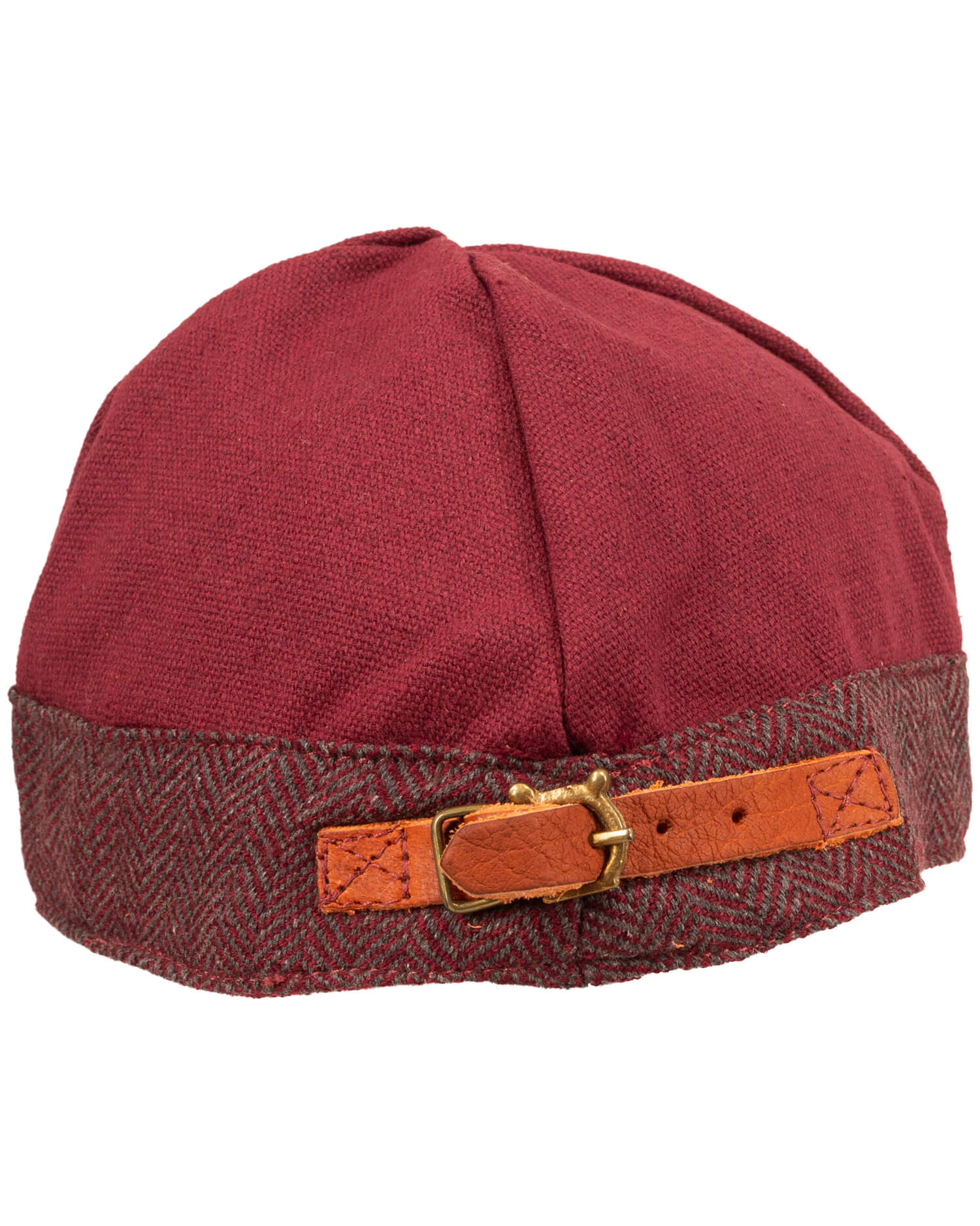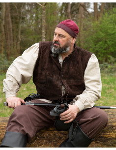 O gorro medieval modelo Gilli na cor bordô é inspirado nos tradicionais gorros redondos da época vikinga, baseados em achados históricos daquela era. Confeccionado em lona resistente, este gorro se destaca pelo seu design robusto e sua decoração com um elegante padrão de espiga na barra, o que realça seu caráter nórdico. Graças à fivela ajustável 'Tasso' na parte de trás, ele se adapta facilmente para proporcionar um ajuste confortável e personalizado.