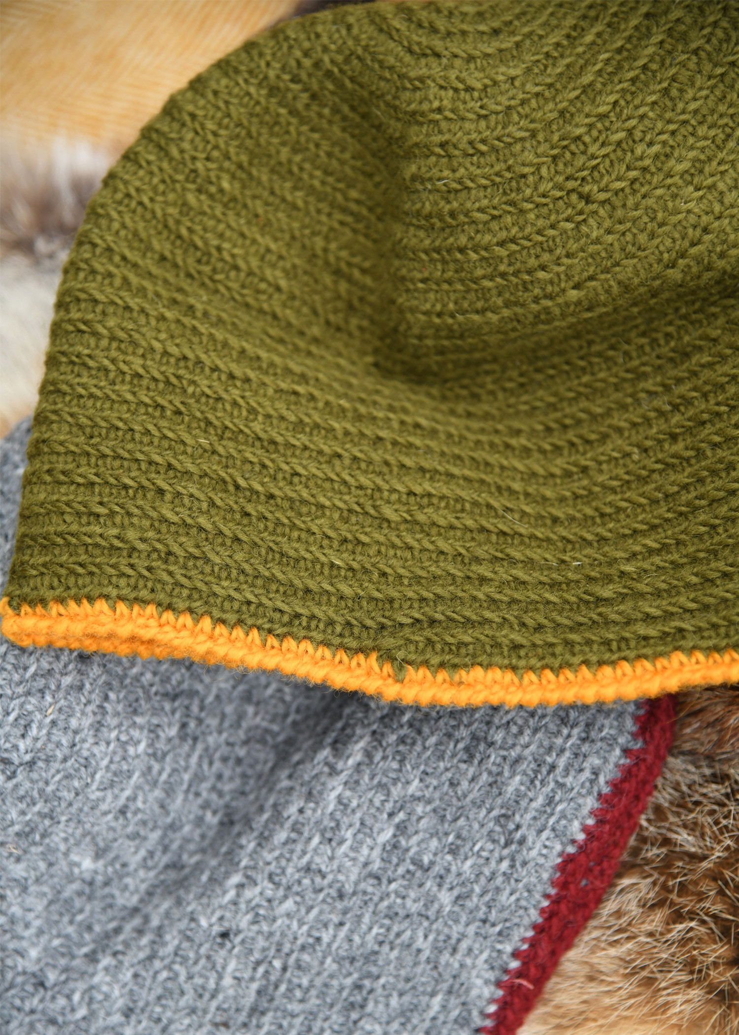 Este gorro de lã verde e amarelo é o complemento perfeito para te manter aquecido no seu próximo mercado medieval, evento de recriação histórica ou partida de RPG ao vivo (LARP). Elaborado de maneira artesanal com lã 100% natural, este gorro foi confeccionado seguindo um padrão inspirado na técnica de tecelagem manual utilizada pelos vikings e outros povos do início da Idade Média. Sua estrutura densa, mas flexível, garantirá conforto térmico em todos os momentos, mesmo em condições de umidade.