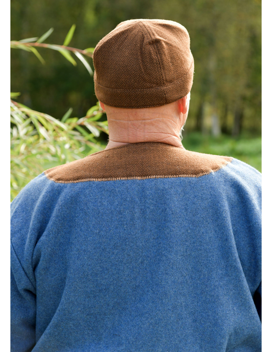Confeccionado em lã 100% natural, oferece um isolamento quente e respirável que mantém a cabeça na temperatura ideal sem amontoar. A sarga com padrão de losangos cria um jogo de luzes e sombras graças aos fios marrom claro e escuro, conferindo uma aparência rica e texturizada que se destaca tanto em eventos históricos quanto no uso diário.
