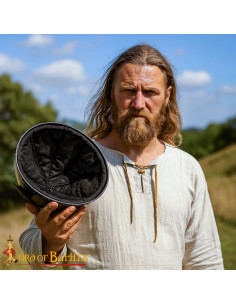 Seu acabamento preto e as costuras visíveis que delineiam os painéis conferem um aspecto autêntico e cuidado, ideal para completar uma vestimenta histórica ou manter uma linha discreta sob um elmo. A borda reforçada dá forma e resistência, para que o gorro mantenha sua presença uso após uso.