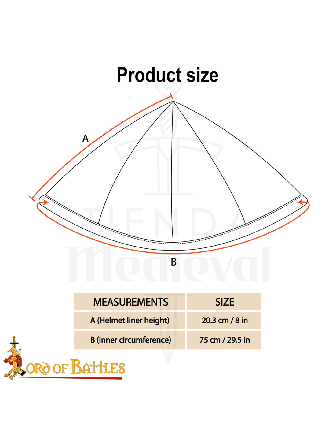 O Gorro medieval acolchoado em algodão branco natural oferece um ajuste seguro graças à sua confecção de seis painéis com costuras visíveis, que se traduzem em estabilidade e melhor distribuição do acolchoado. A combinação de uma camada exterior resistente com um forro suave proporciona uma sensação agradável em contato com a pele, ideal para sessões longas sob um capacete ou como peça independente.
