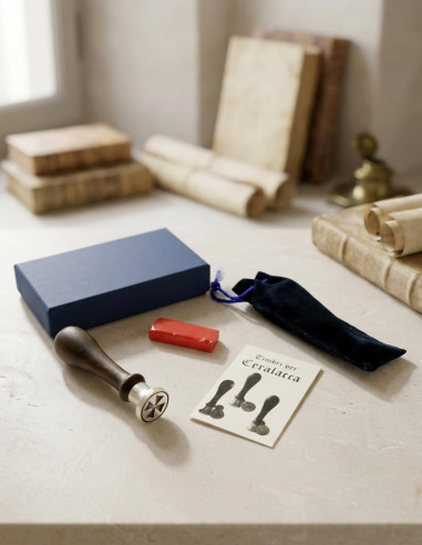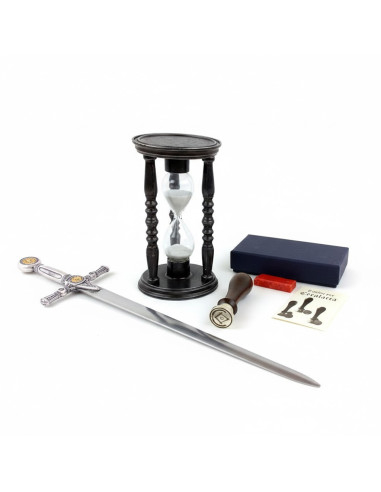 Pack Maçônico Entre o Compasso e a Areia composto por ampulheta, abridor de cartas e selo de cera