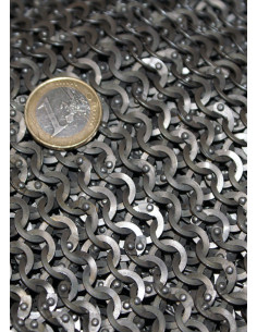 Confeccionada em anéis metálicos cuidadosamente entrelaçados, seu design garante uma flexibilidade que acompanha cada movimento sem sacrificar a resistência. A borda inferior com pontas irregulares não só acrescenta um toque visual único, mas também reflete um acabamento autêntico e elaborado, inspirado nas armaduras históricas mais emblemáticas.