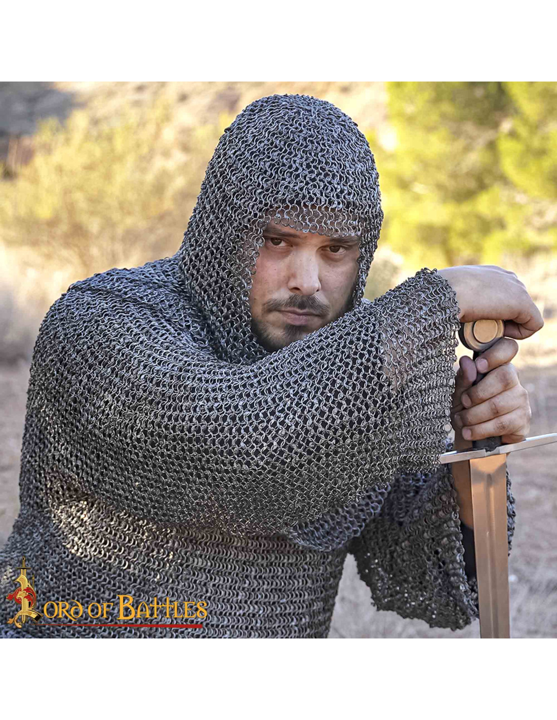 Esta peça oferece uma defesa que se adapta ao corpo, graças ao seu tecido de anéis rebentados à mão, o que se traduz em uma flexibilidade que acompanha a cabeça e o pescoço sem rigidez incômoda. O rebentado redondo assegura que cada giro e cada inclinação sejam realizados com segurança, permitindo manobrar com confiança durante recriações ou treinamentos históricos.
