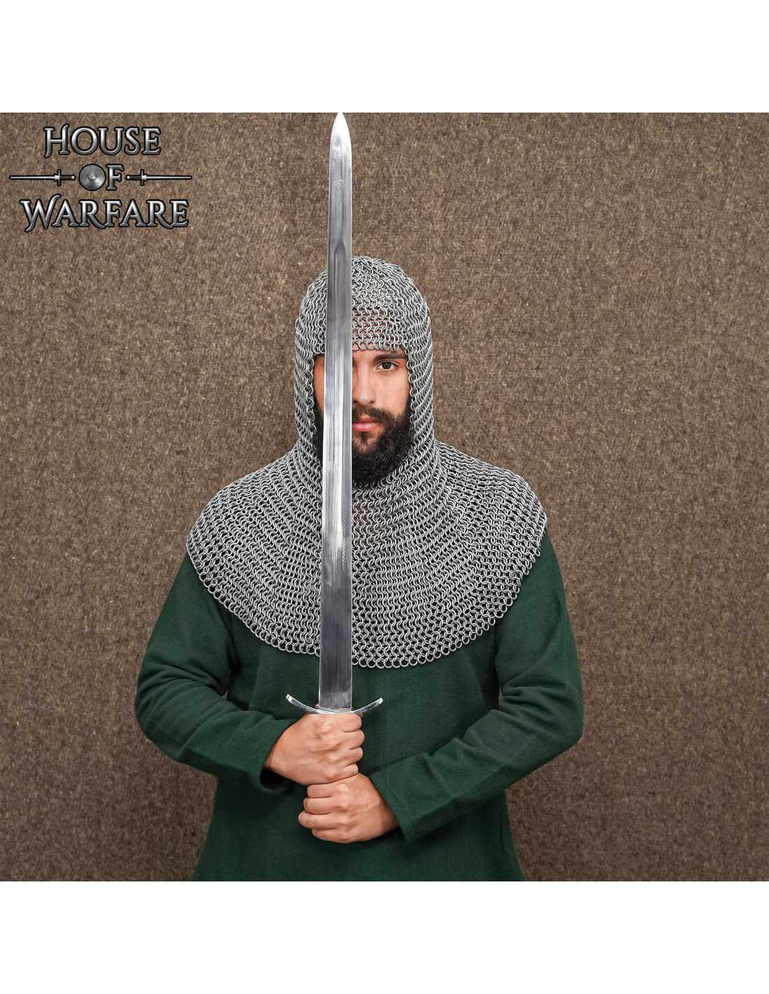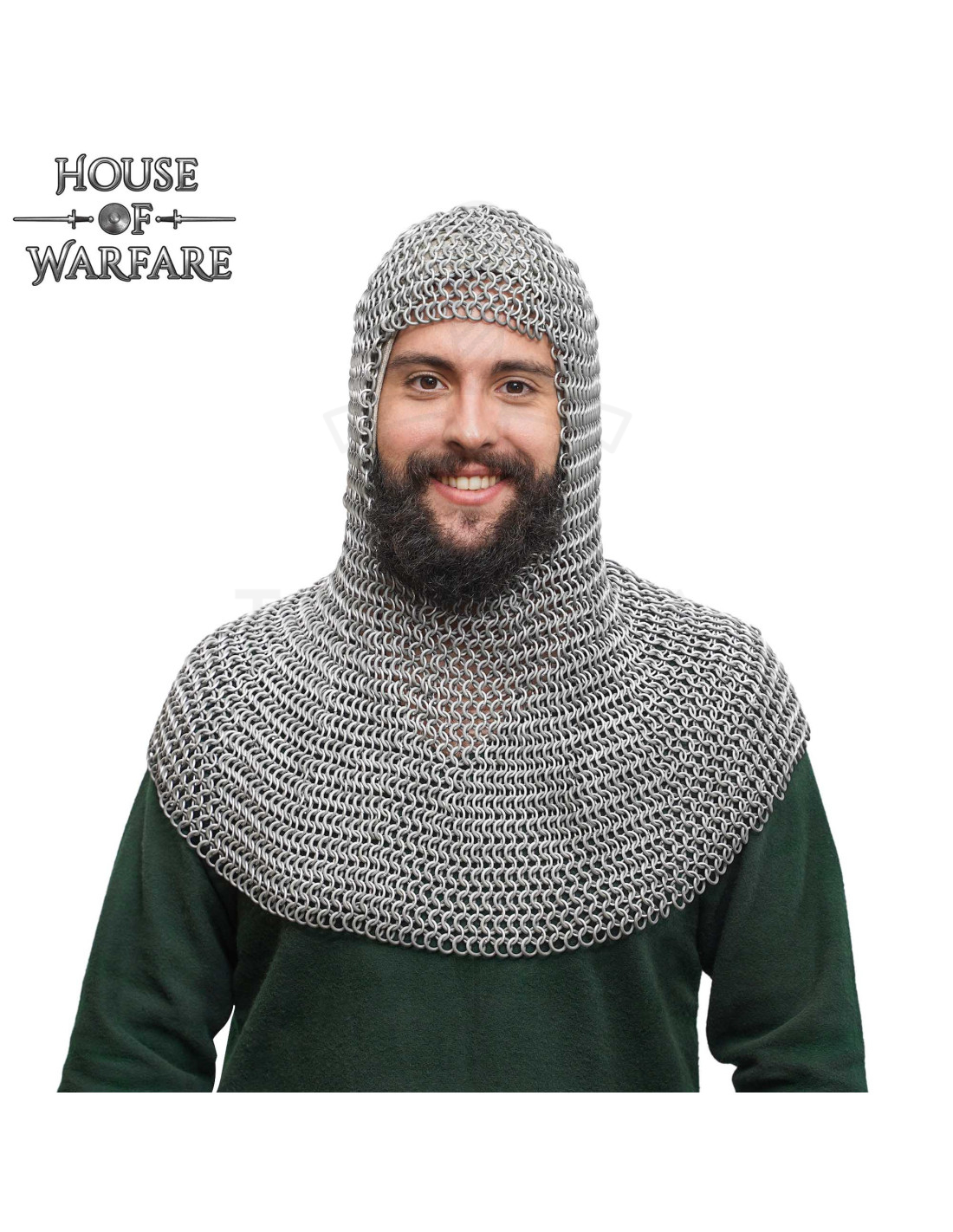 Esta cofia evoca o período medieval dos séculos XII ao XIV, recriando a silhueta clássica europeia com um voo na borda que protege o pescoço e os ombros sem limitar os movimentos. Seu acabamento cinza fosco com aparência de aço proporciona um aspecto robusto e realista, como pode ser visto na imagem, onde a malha cai naturalmente sobre a cabeça, os ombros e a parte superior do peito.