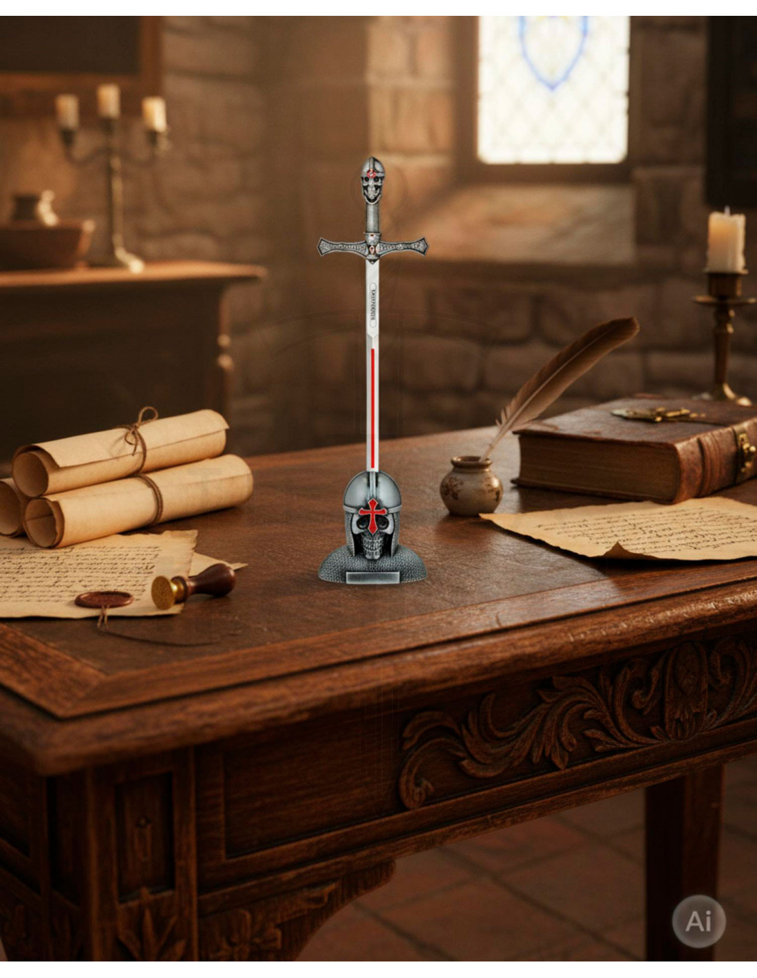 O kit inclui um suporte templário de fantasia, projetado com acabamento metálico na cor prateada e detalhes em relevo que evocam a armadura medieval. A caveira no capacete e a cruz vermelha na parte frontal conferem um estilo gótico e simbólico que não passa despercebido. Com 7,2 cm de altura, é compacto e prático para segurar a espada, um abridor de cartas ou pequenos objetos, mantendo sua mesa organizada com um ar sombrio e espetacular.