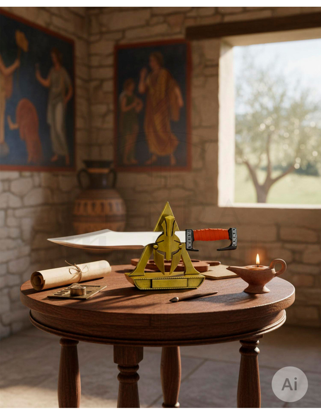 Dê caráter e estilo ao seu escritório, sala de jogos ou coleção com este conjunto exclusivo inspirado na grandeza da antiga Esparta. O kit inclui um abre-cartas em forma de espada espartana e um suporte combinando, duas peças que unem funcionalidade, elegância e um inconfundível ar histórico.