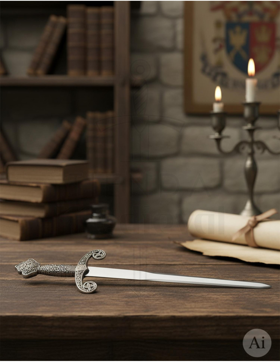 Abridor de cartas Alfonso X. Imitação da espada de Afonso X em tamanho abridor de cartas com lâmina de aço inoxidável. É um belo detalhe para ter em nosso escritório, ou para presentear.