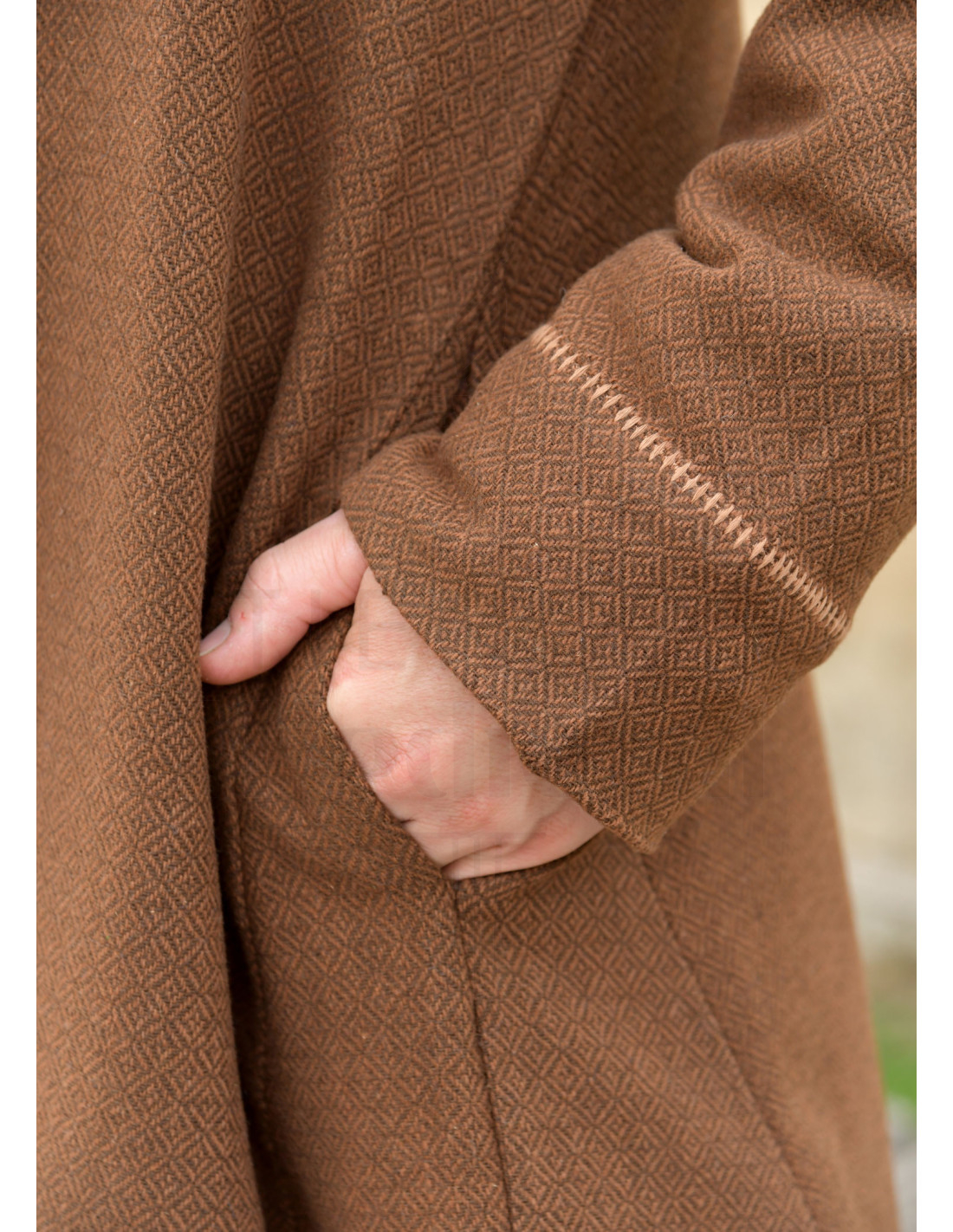 Os reforços nas laterais criam uma caída mais ampla na parte inferior, permitindo liberdade de movimento e um voo elegante ao caminhar, ideal para deslocar-se naturalmente em eventos ao ar livre. Os bolsos discretos, integrados na altura do quadril, mantêm suas mãos livres para ferramentas, mapas ou pequenos objetos, sem quebrar a silhueta histórica.