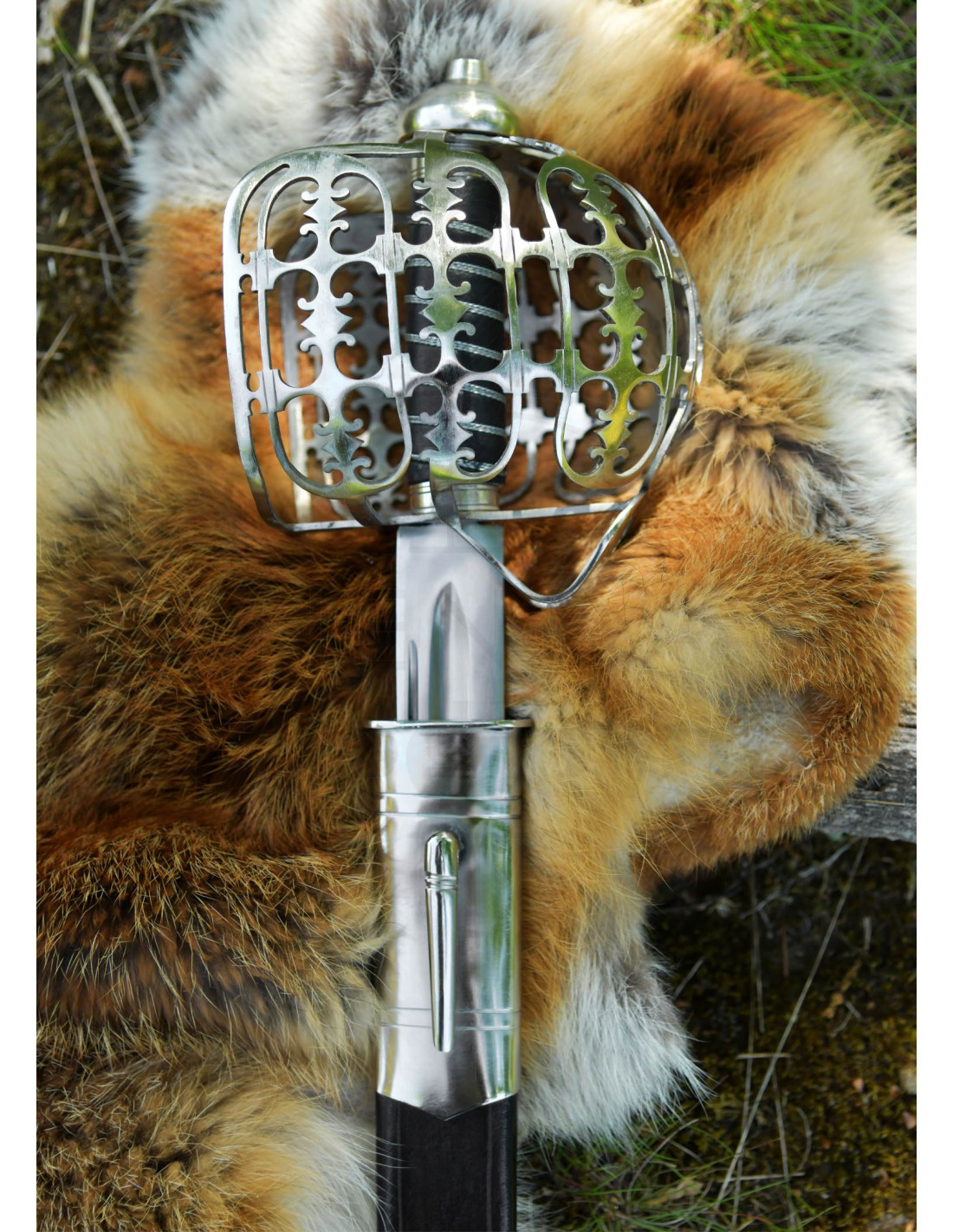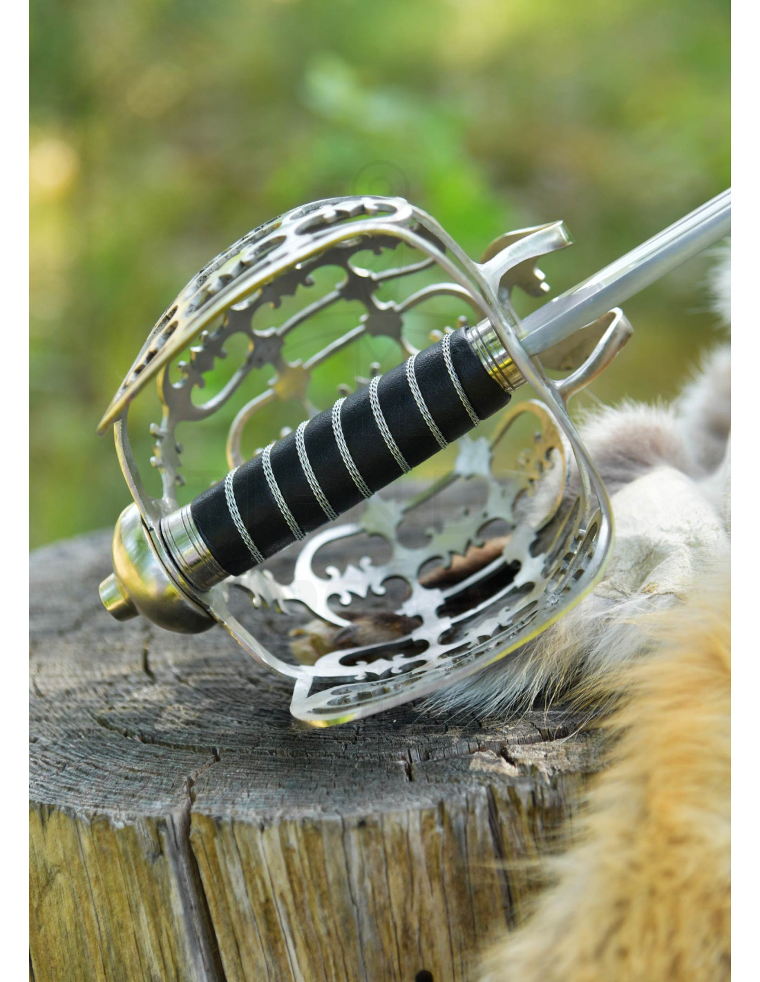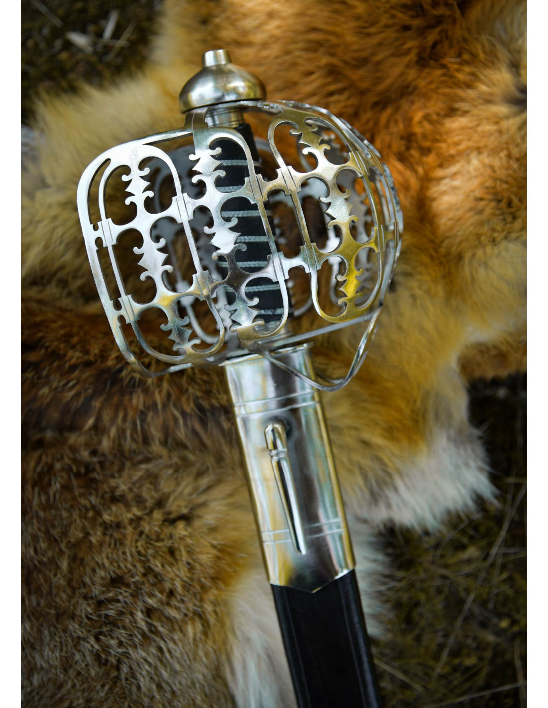 A empunhadura com núcleo de madeira, revestida em couro preto e finalizada com uma enrolagem de fio, garante uma aderência firme e visualmente fiel ao original, trazendo calor ao toque e um acabamento histórico. A guarda de gaiola de aço, finamente calada e perfurada, envolve a mão com um caráter ornamental que também transmite solidez e proteção visual.