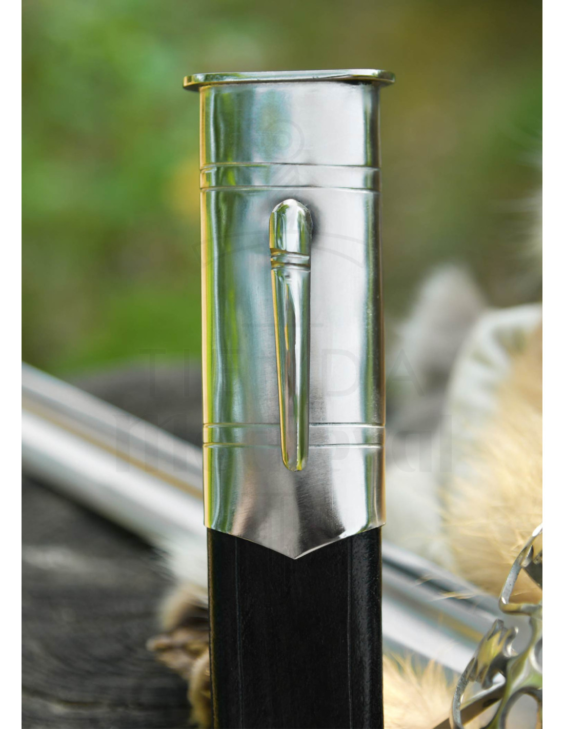 A bainha de couro preto, perfeitamente ajustada, chega equipada com acabamentos de aço na boca e na ponta, além de uma alça metálica superior que destaca seu acabamento cuidadoso, facilitando uma apresentação impecável na parede, vitrine ou sobre um pedestal.