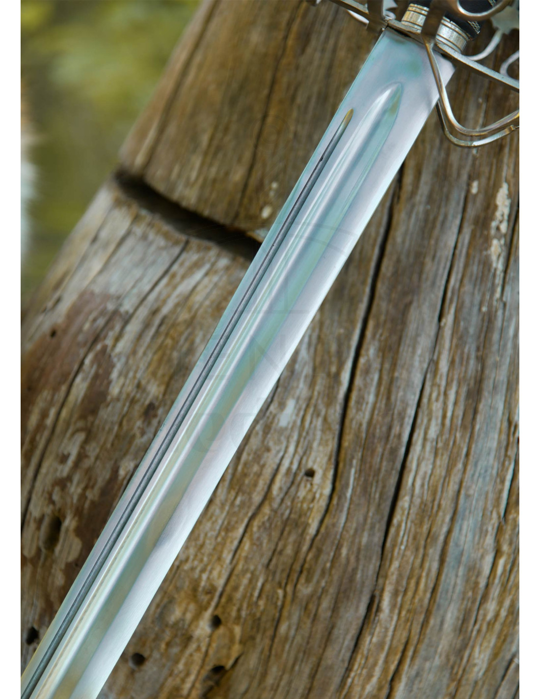 A lâmina, forjada em aço carbono de alto carbono C60, oferece aquele brilho metálico e perfil clássico que colecionadores e recriadores apreciarão, enquanto os pregadores e canais do aço realçam a silhueta sem perder a elegância. Esse design da lâmina proporciona uma sensação de equilíbrio e uma estética autêntica, perfeita para exibição.