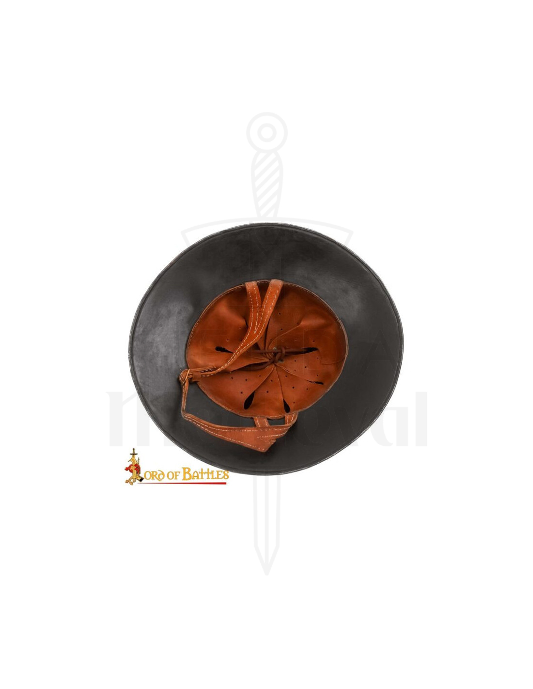 Este elmo oferece uma proteção superior contra golpes descendentes, flechas e fragmentos, graças ao seu design com aba larga que desvia impactos sem obstruir sua visão. Seu acabamento polido não só realça seu aspecto em cena ou em vitrine, como também facilita a manutenção, evitando o deterioramento prematuro, para que o elmo se apresente impecável uso após uso. A suspensão interna de couro, ajustável, envolve a cabeça com conforto, reduzindo a fadiga em longas jornadas de recreação ou filmagens e mantendo o elmo firme durante movimentos intensos.