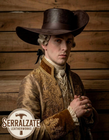 Chapéu Tricornio de Capitão com Gravação Barroca, Couro Marrom Deluxe