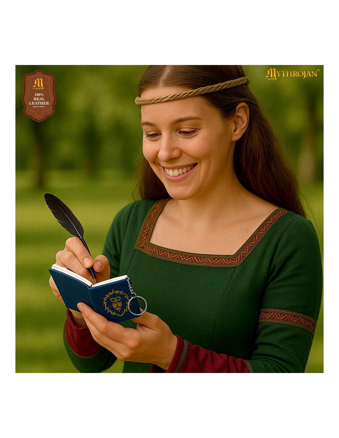 Este pequeno relicário transforma um gesto cotidiano em uma declaração: a capa azul escura com textura de couro e o leão dourado gravado mostram seu compromisso com a Aliança com estilo, enquanto o anel metálico prateado facilita levá-lo sempre consigo. Mais do que um adorno, é uma agenda real com páginas brancas prontas para capturar ideias rápidas, estatísticas de personagem, notas de campanha ou citações que você deseja guardar.