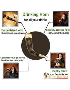 Buzina com manchas carbonizadas e acessórios de latão. Feito à mão a partir de chifre de boi de origem ética, a capacidade total do chifre é de aprox. 300-400 ml (de um líquido com até 20% de teor alcoólico). Evite lava-louças e bebidas quentes. Antes de usar, certifique-se de lavar em água corrente. Para uma vida mais longa, trate com cera de abelha após cada uso. Observe que este é um produto natural que se decompõe com o tempo e, portanto, podem aparecer rachaduras.