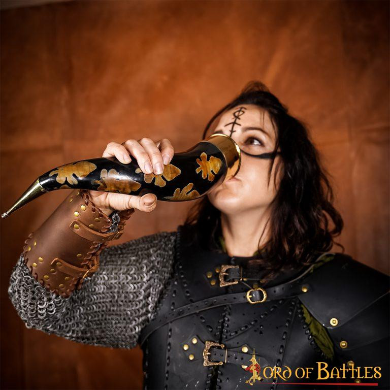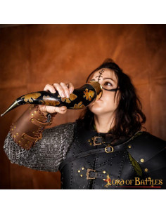 Graças à sua capacidade de aproximadamente 300-400 ml, poderá desfrutar das suas bebidas preferidas, seja uma cerveja gelada com os seus amigos num encontro casual ou um delicioso hidromel numa noite especial. Além disso, o chifre é projetado com manchas carbonizadas e acessórios de latão ornamentados, tornando-o um item visualmente atraente e elegante que certamente chamará a atenção de todos os seus convidados.