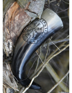 O chifre de beber que oferecemos aqui é feito à mão de chifre de gado, polido e embelezado com uma gravura vegvísir emoldurada por uma sequência de runas. O vegvísir (desbravador) é um símbolo mágico ou chamado sigilo (galdrastafir) de origem islandesa. Uma representação real deste símbolo aparece pela primeira vez no manuscrito islandês de 1860 Huld de Geir Vigfússon, uma coleção de runas/feitiços e sigilos. Aí diz: