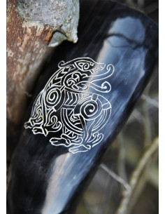 O chifre de beber que oferecemos aqui é feito à mão de chifre de gado, polido e embelezado com um dragão gravado, um motivo popular na arte viking.