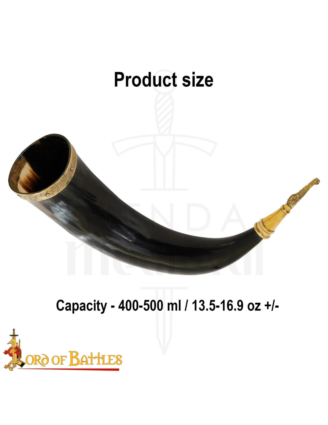 A funcionalidade se funde com o luxo graças aos seus acabamentos em latão. A borda de latão sólido não apenas reforça a boca do corno, garantindo uma durabilidade excepcional, mas também adiciona um toque dourado e ornamentado. A ponta de latão completa o design, tornando o corno tão resistente para o uso frequente quanto majestoso para ser exibido. Com uma capacidade generosa de 400 a 500 ml, você poderá desfrutar de seu hidromel ou cerveja como um verdadeiro Northman.