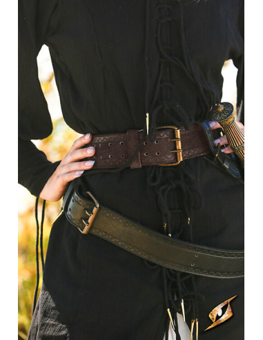 Seu acabamento resistente permite que o cinto evolua com o uso, adquirindo uma aparência envelhecida que acrescenta caráter a qualquer roupa. É versátil para múltiplos estilos históricos e de fantasia: medieval, pirata, de aventuras ou cosplay, facilitando a combinação com túnicas, casacos ou trajes de personagens ousados. Disponível nas cores preta e marrom, oferece opções para diferentes personalidades e estilos, do mais sombrio ao explorador com um toque mais rústico.