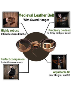 Não perca a oportunidade de adicionar este fascinante cinto de couro marrom estilo medieval com baldric à sua coleção de acessórios de cavaleiro. Mostre seu estilo único e autêntico enquanto chama a atenção com este cinto distinto.