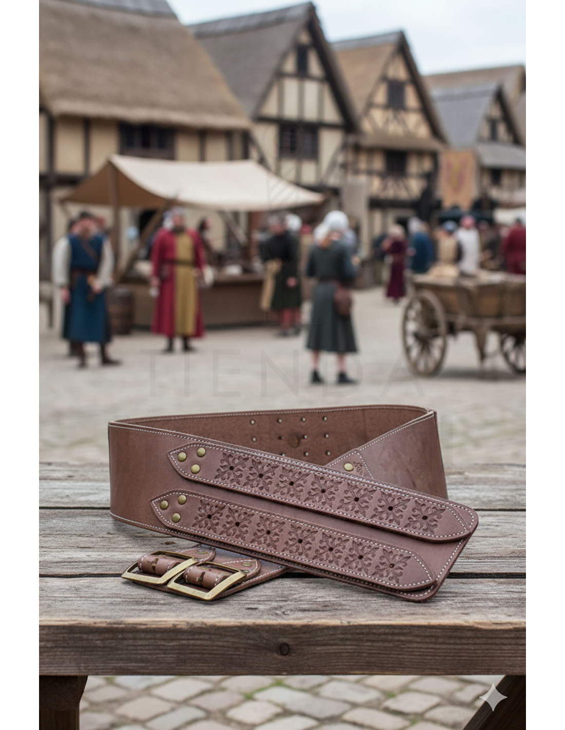Uma das características mais destacadas deste cinto é sua decoração lombarda gravada com motivos medievais. Essas ornamentações conferem um toque de autenticidade único, transportando você diretamente para a época medieval que tanto admira. Além disso, as costuras na borda acrescentam um detalhe adicional que realça sua qualidade e design.