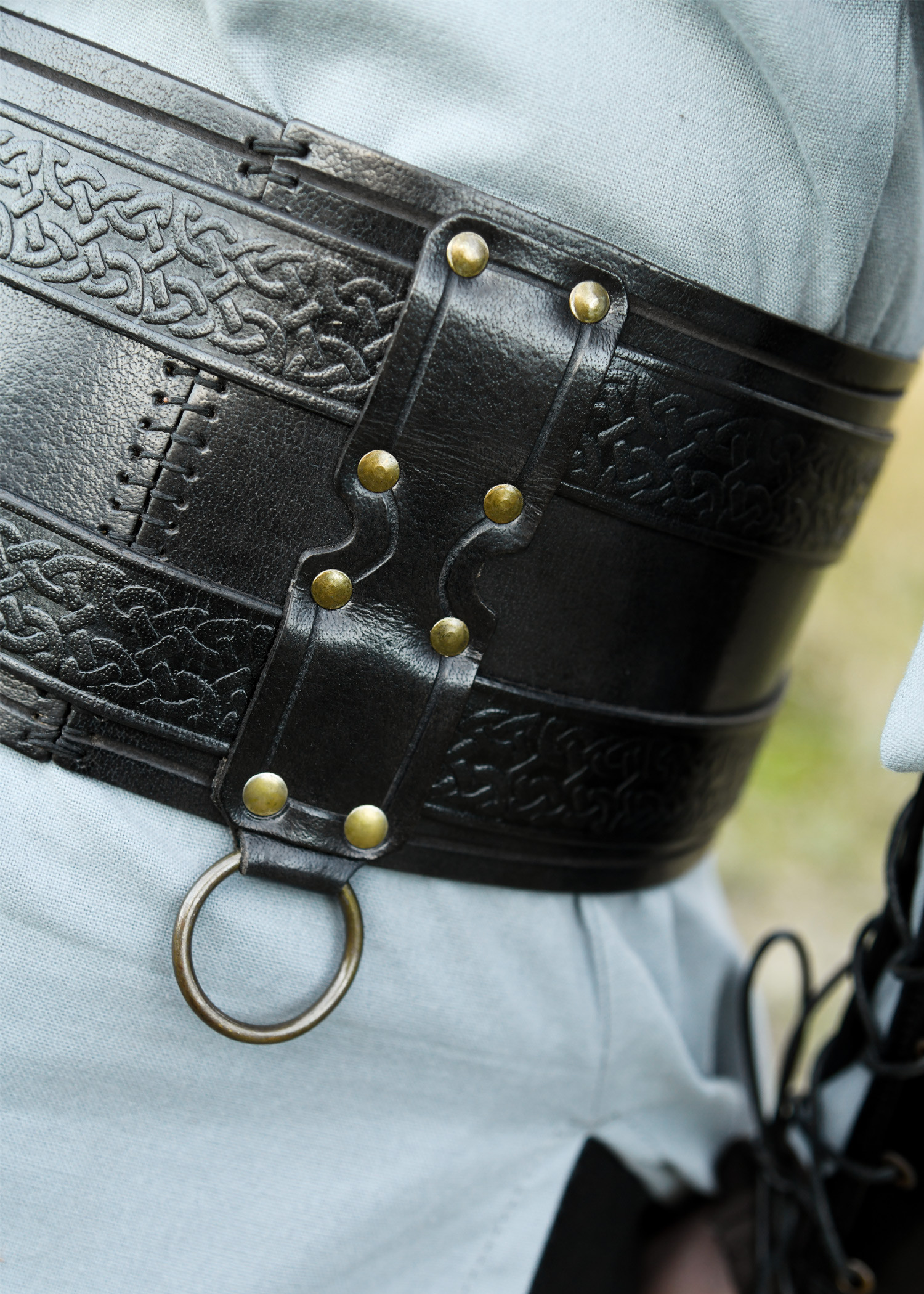 Este cinto não é apenas visualmente impactante, mas também funcional: o anel de metal integrado é ideal para carregar ferramentas, bolsas ou até mesmo uma bainha para sua espada, trazendo praticidade em eventos de recriação histórica, cosplay ou LARP.