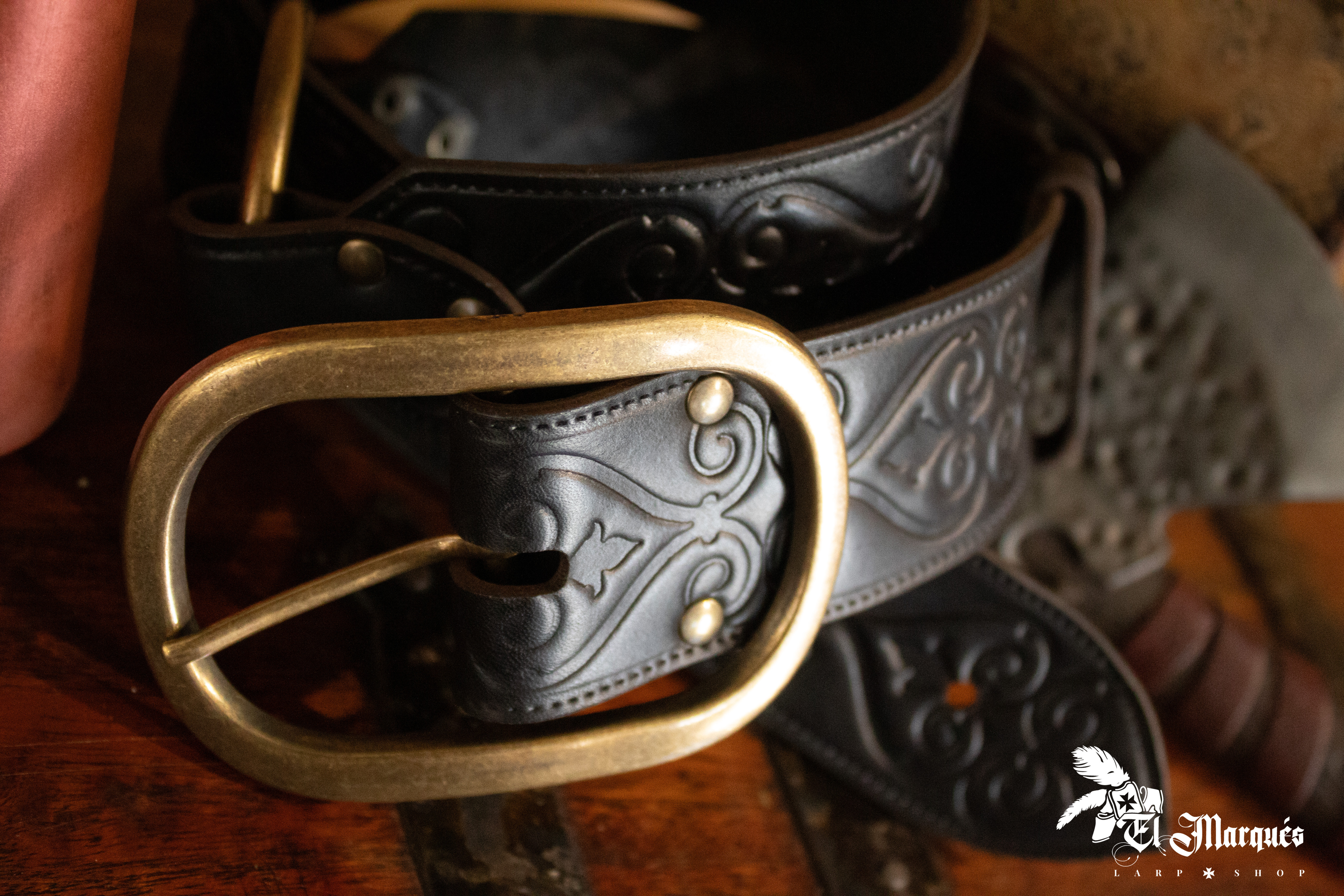 Cinto medieval em couro negro com adornos em latão, estilo gótico