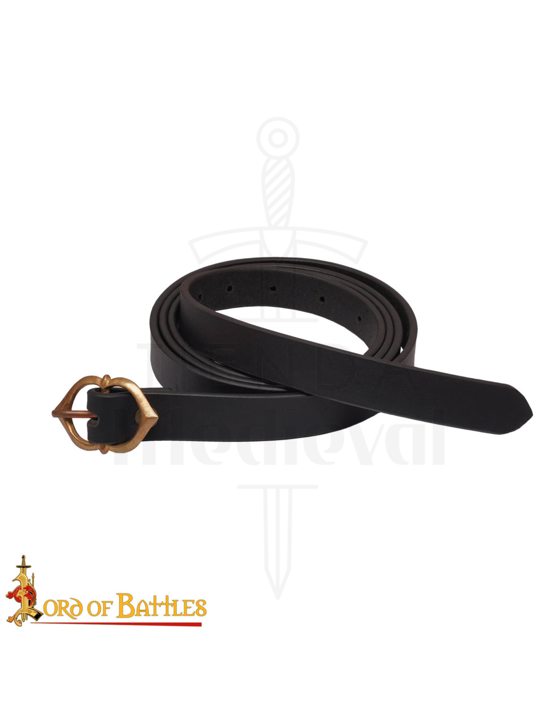 Fabricado em couro preto com acabamento liso, oferece uma sensação de firmeza que transmite segurança ao usá-lo, sem renunciar ao conforto no dia a dia. A fivela de bronze com tom dourado envelhecido e extremidades levemente pontiagudas traz um toque de autenticidade, e ao refletir a luz, torna-se perfeita para destacar-se em reuniões, eventos ou recriações históricas sem parecer ostentoso. A extremidade cortada em pico e os vários orifícios de ajuste facilitam um encaixe preciso, para que a aparência seja sempre impecável, seja com roupas informais ou com vestuário de época.