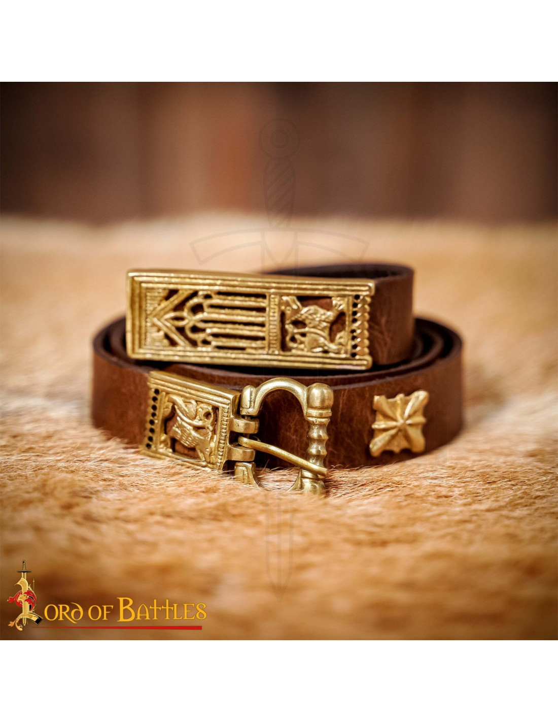 Os adornos dourados, incluindo uma fivela com relevo decorativo, uma extremidade finalizada e pequenos motivos agrupados em relevo, estão dispostos ao longo da tira para criar continuidade visual e um acento gótico coerente com a inspiração histórica. Este trabalho artesanal significa que cada peça traz um caráter único, ideal para eventos temáticos, representações, exposições ou para quem coleciona acessórios com presença cênica.