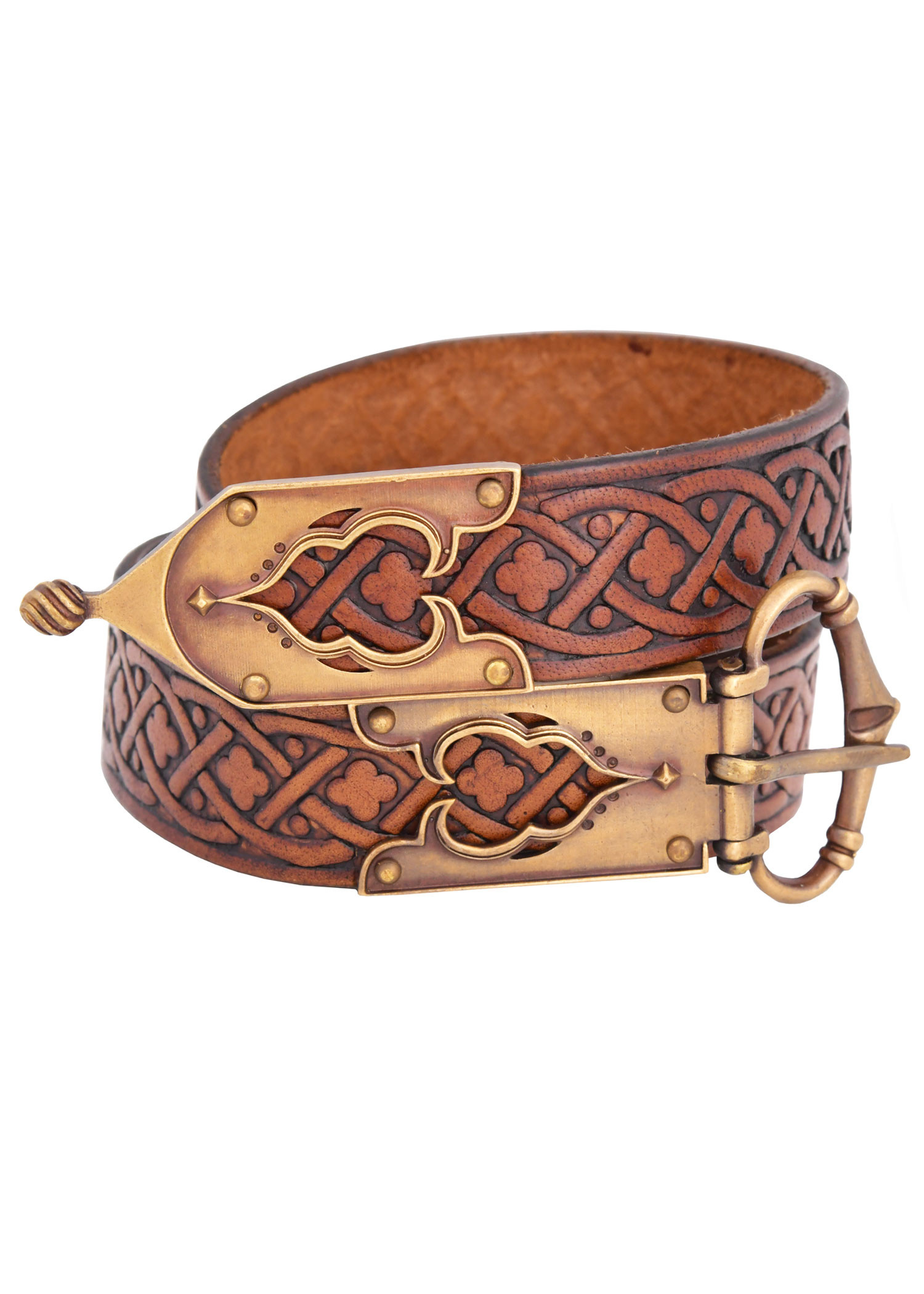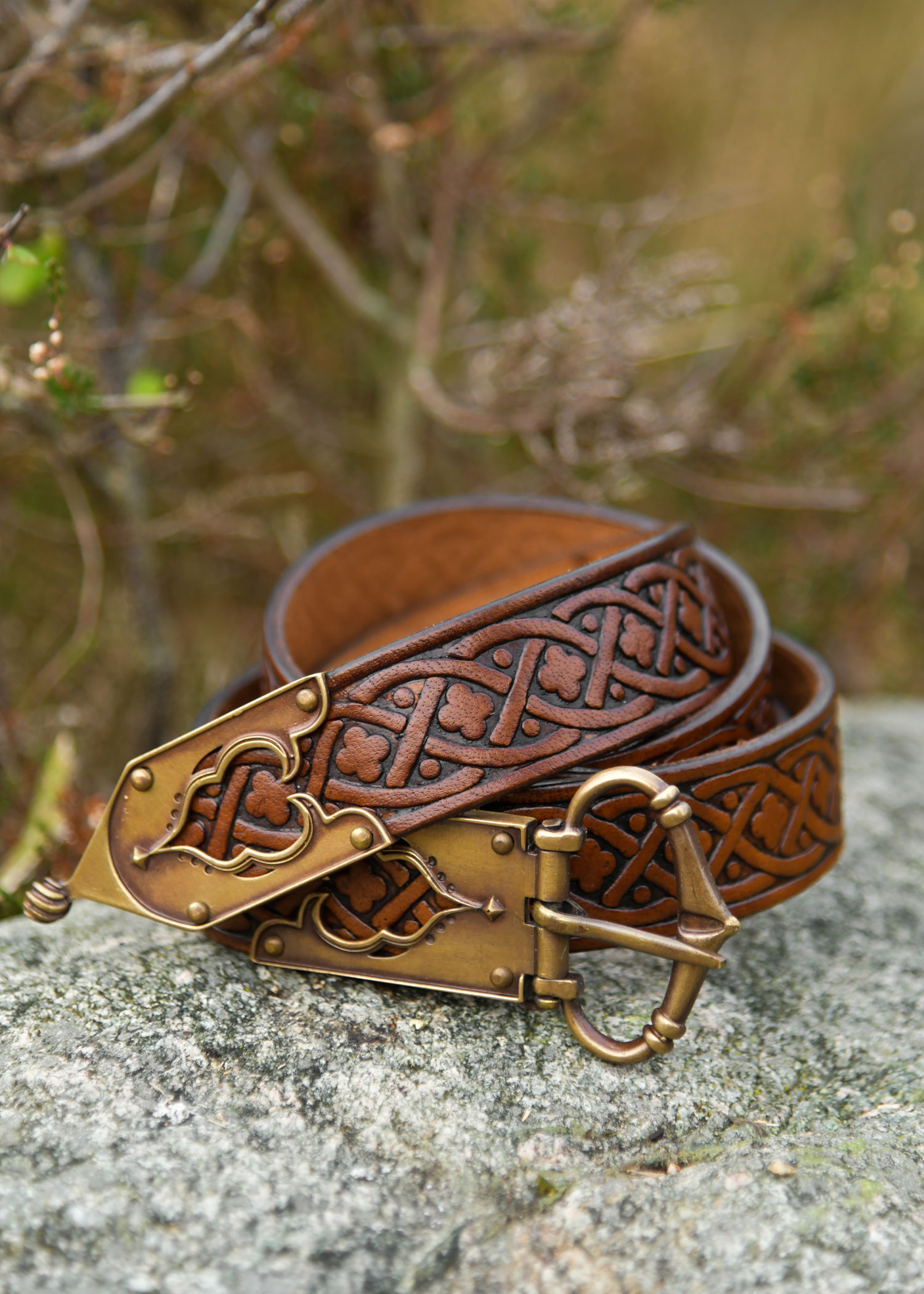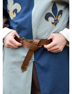 Este cinto combina um couro resistente, trabalhado para manter sua forma e envelhecer com graça, com um relevo contínuo que mistura trançados geométricos e delicados motivos de trevo. A gravação percorre toda a fita, oferecendo um aspecto artesanal que realça tanto trajes históricos quanto propostas modernas, adicionando textura e personalidade onde mais precisa.