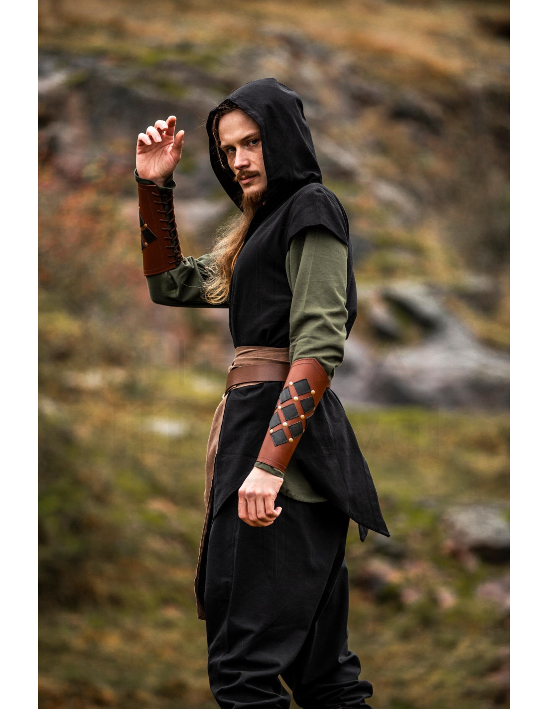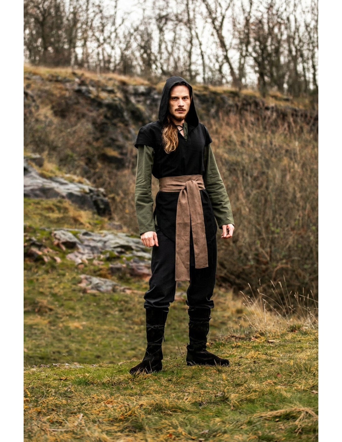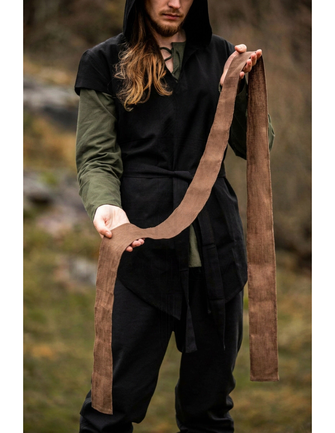 A textura mate e levemente áspera do tecido aporta um caráter rústico e com reminiscências antigas, perfeito para somar autenticidade sem esforço. Por ser de linho, mantém uma sensação natural e confortável que acompanha tanto em eventos ao ar livre como em recriações onde o realismo e a aparência contam.