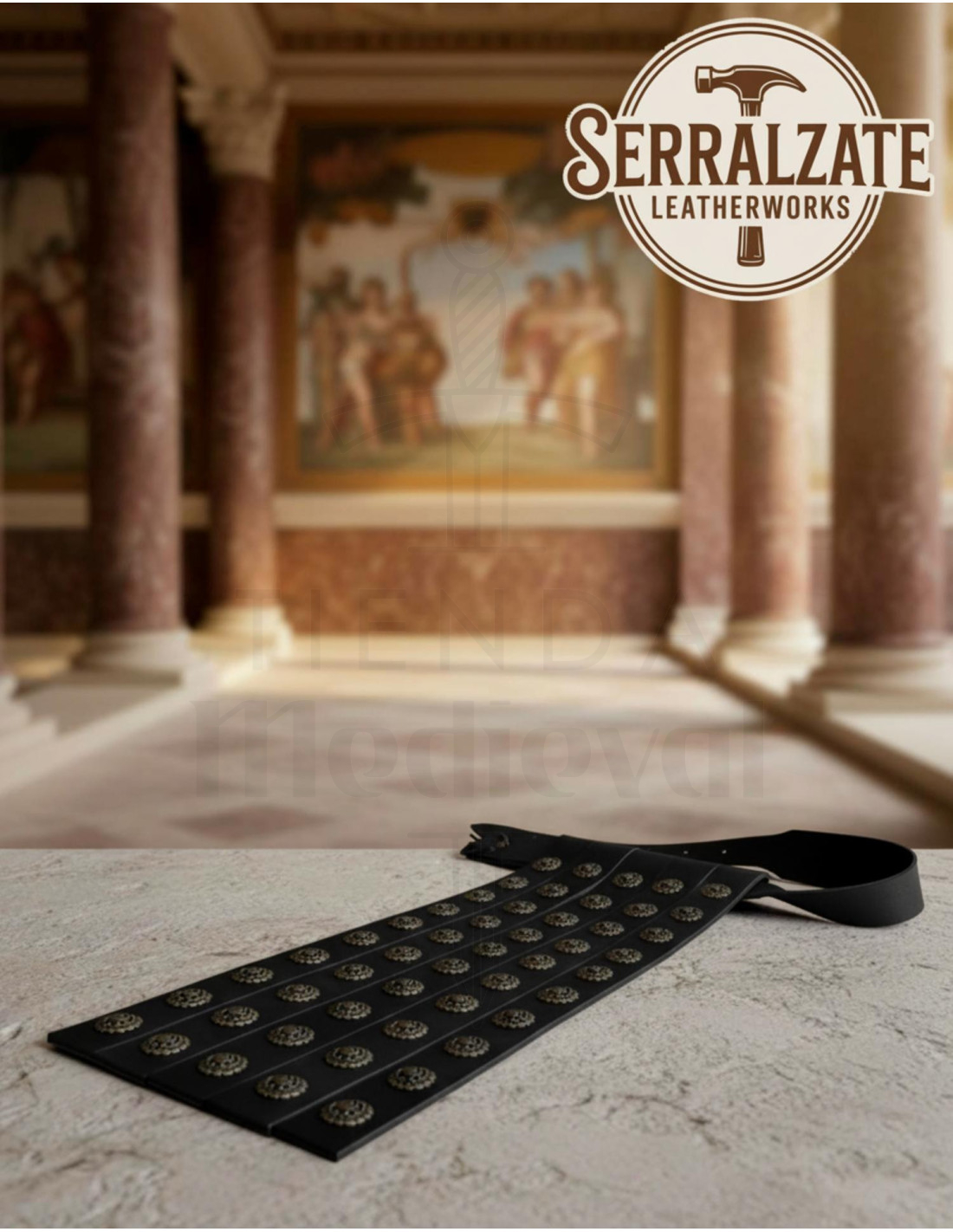 Relacionado ao cingulum militare, o Cinto militar romano em couro preto 4 pteryges rememora o papel do soldado como símbolo de status e disciplina, presente em monumentos e relevos antigos. Esse fundo proporciona um valor histórico palpável, que adiciona significado à sua presença sobre qualquer vestuário.