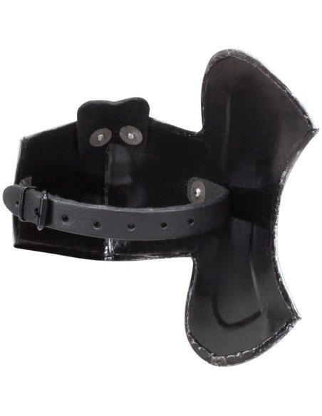 O design anatômico se adapta à curvatura do braço, com reforços visíveis que transmitem solidez e uma base interior de tom escuro que sugere conforto durante longas jornadas. Graças à sua suspensão prática, integra-se facilmente com a proteção superior Nova através de cordão de couro, ou é montada sobre gambesão ou malha sem complicações, permitindo combinações variadas de acordo com seu equipamento ou estilo.