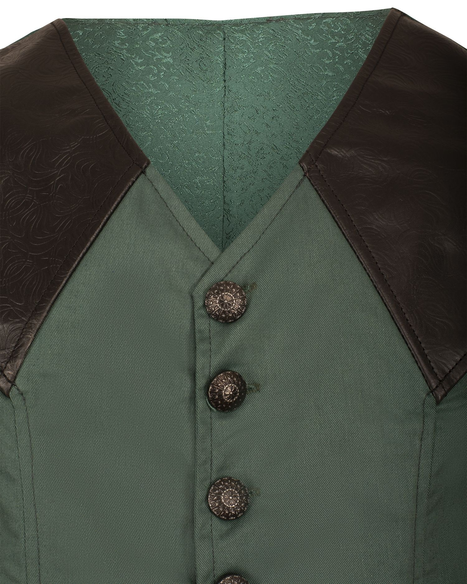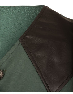 O colete gótico medieval modelo 'Darovin' na cor verde é uma peça que irradia elegância e audácia. Com elaboradas aplicações de couro gravadas nos ombros e nos bolsos, este colete oferece um aspecto distinto e refinado, perfeito para aqueles que buscam uma vestimenta que combine um ar nobre com um toque sombrio.