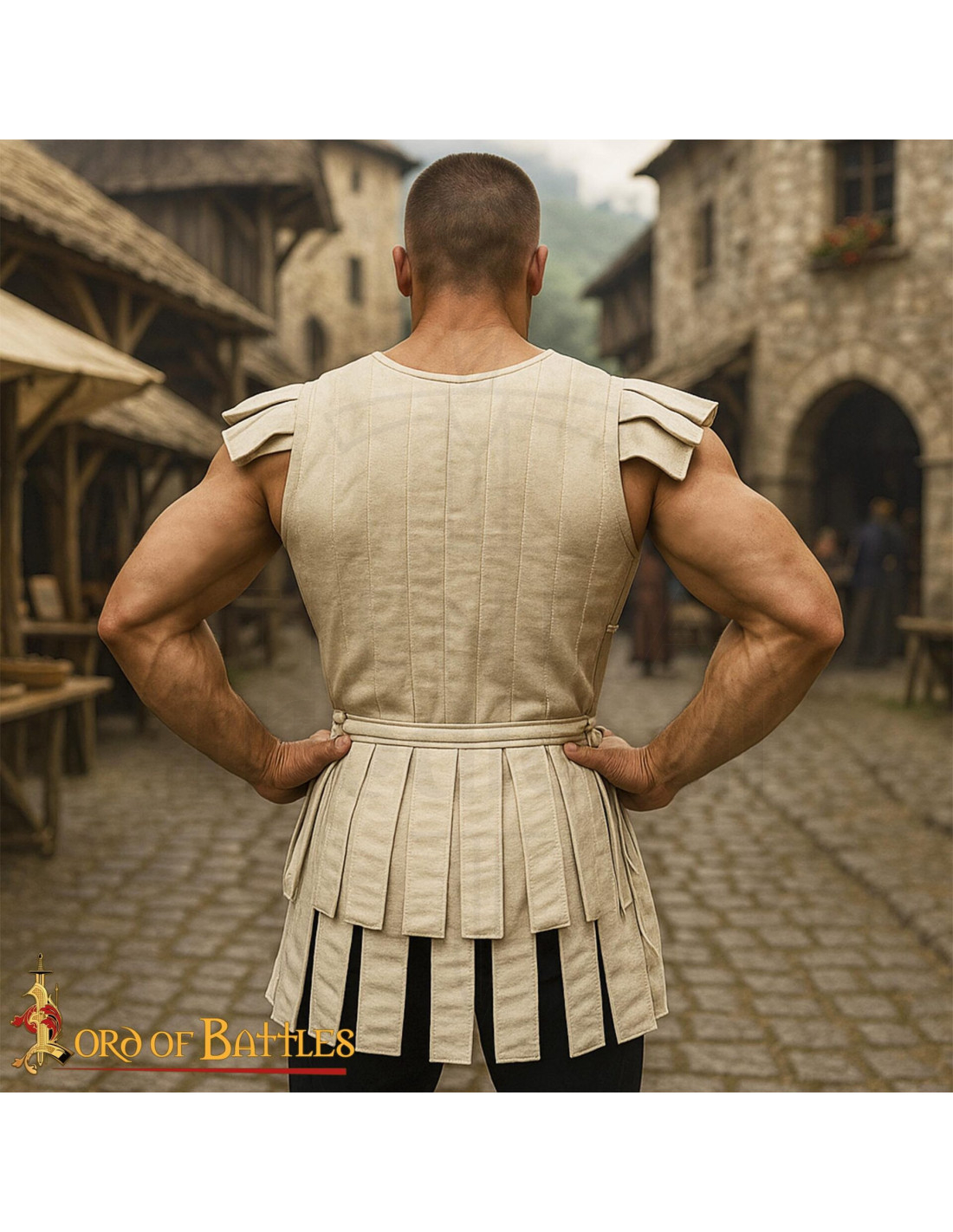 O fechamento lateral com cordões garante um ajuste personalizável, ideal para adaptar a peça sobre uma túnica ou sob peças metálicas, e o tecido externo resistente com costuras reforçadas assegura durabilidade para uso repetido em LARP, SCA, teatro ou filmagens. As leves variações no acabamento e na costura realçam seu caráter artesanal, dando um aspecto único a cada peça.
