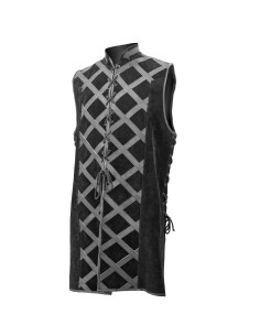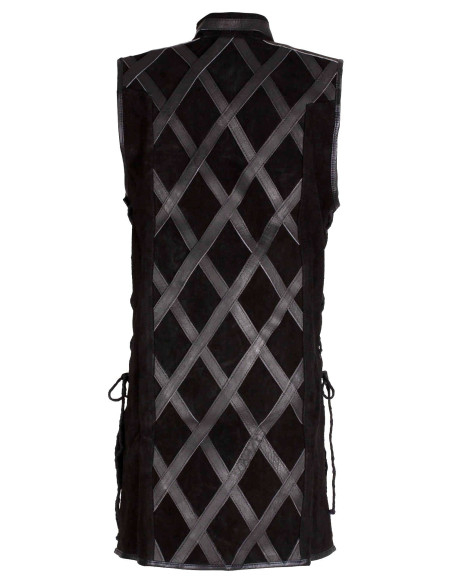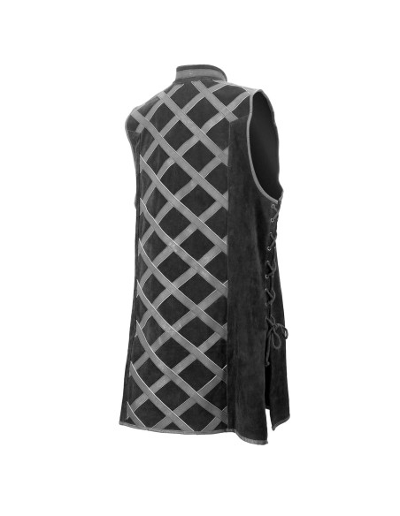 O fechamento com cordões frontais e laterais permite ajustar a silhueta rapidamente, garantindo liberdade de movimento sem abrir mão de um ajuste seguro. Por ser sem mangas, facilita a combinação com capas ou peças armadas, mantendo os braços livres para qualquer tarefa ou combate, e o colarinho mao rígido mantém uma linha firme que reforça a postura e a aura de autoridade.