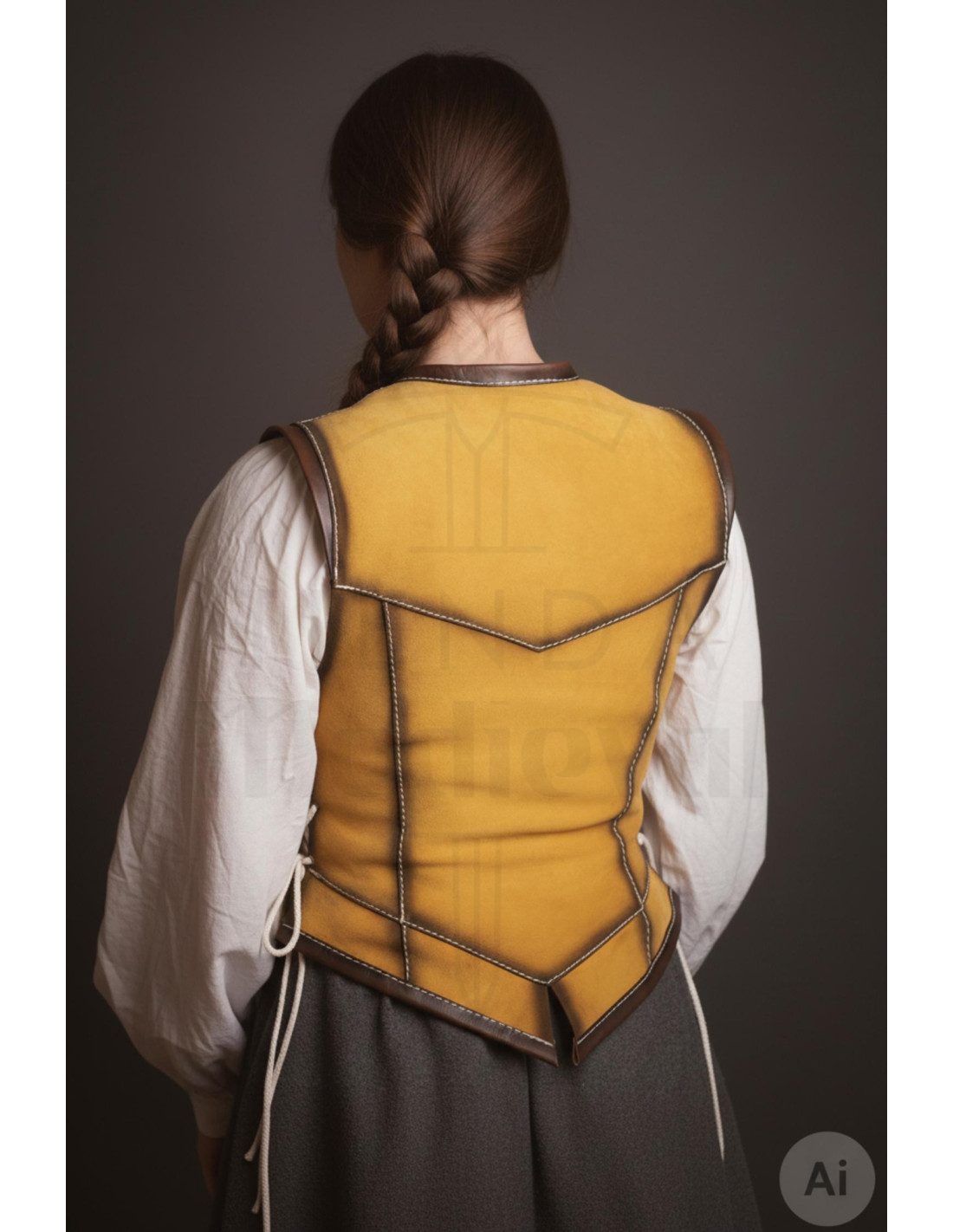 Esta coura traz um acabamento amarelo que não passa despercebido, pensada para quem busca destaque sem abrir mão da funcionalidade. O camurça de qualidade, reforçado com couro no pescoço, mangas, barra e parte frontal, oferece uma sensação de robustez e flexibilidade que acompanha você tanto em movimento quanto nas pausas entre cenas ou banquetes.