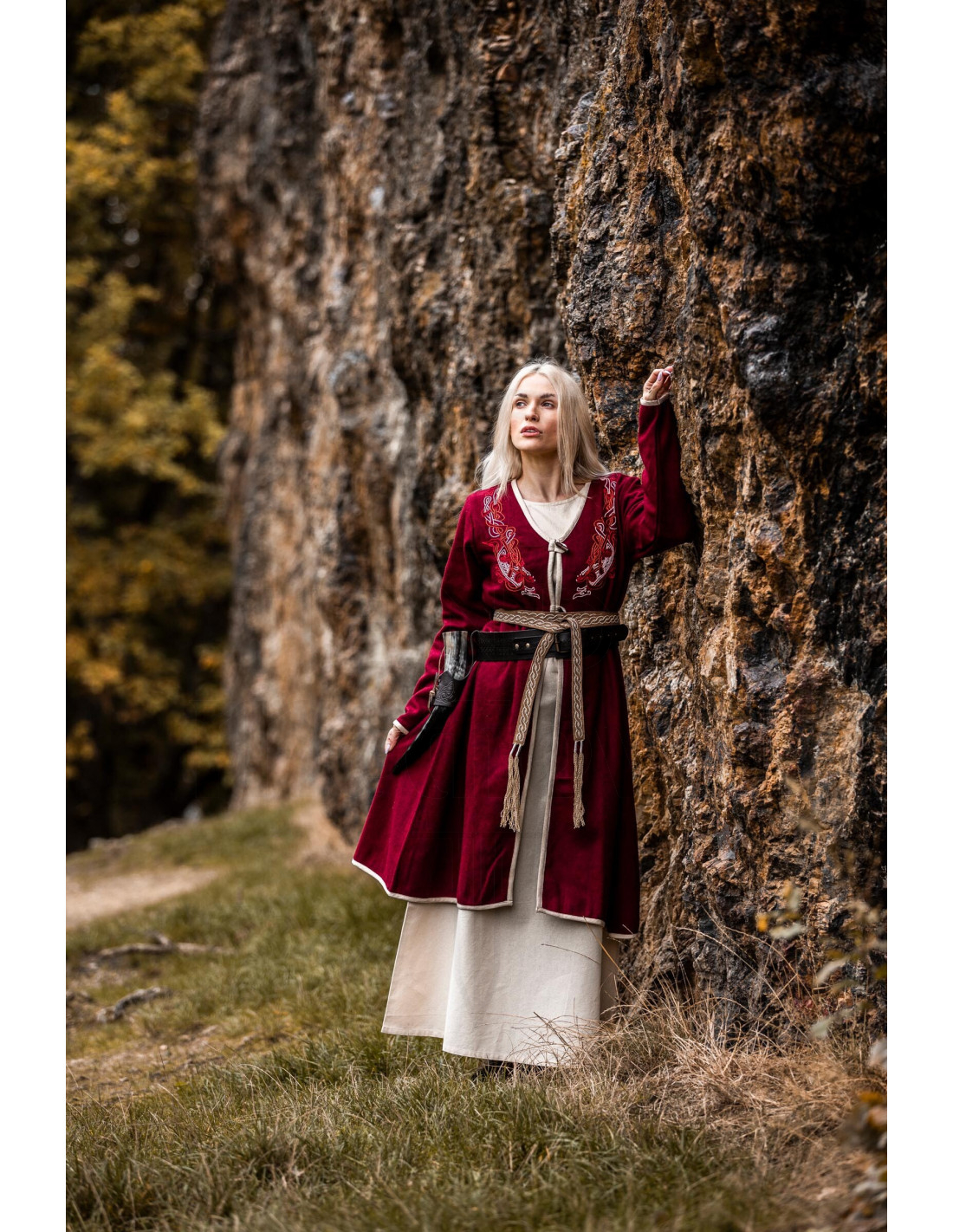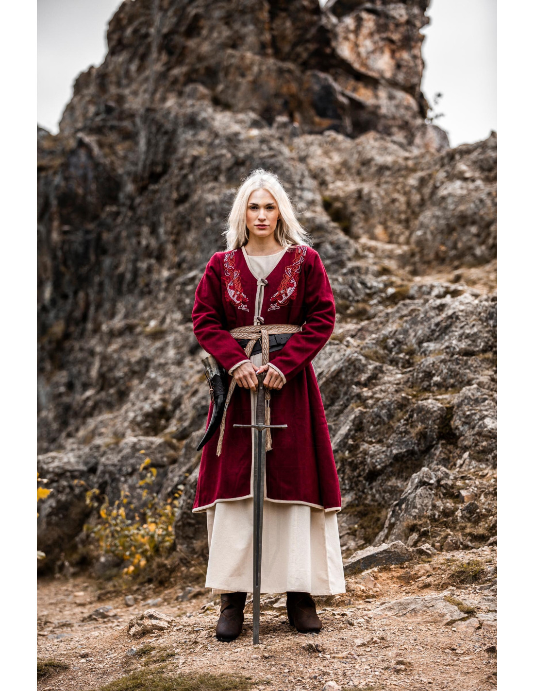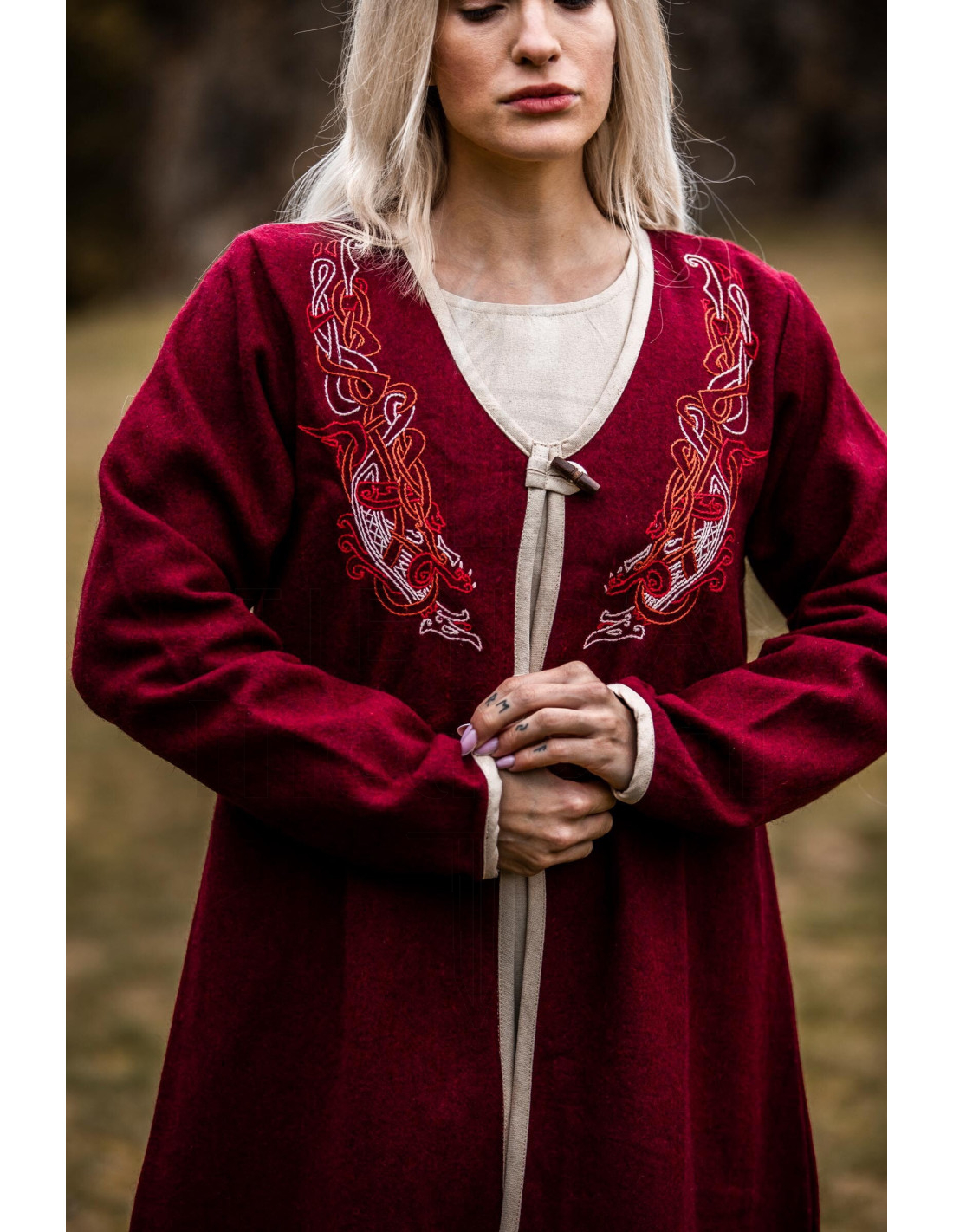 O Casaco vikinga feminino Birka Skadi, vermelho, oferece esse efeito imediato, graças ao seu corte longo e fluido que acompanha cada passo e cria uma silhueta elegante sem limitar seus movimentos. O fechamento frontal com botões de madeira dá um toque rústico e prático, fácil de abotoar mesmo com luvas, enquanto a borda contrastante e os bordados no peito adicionam personalidade e distinção que falam de tradição e bom gosto.