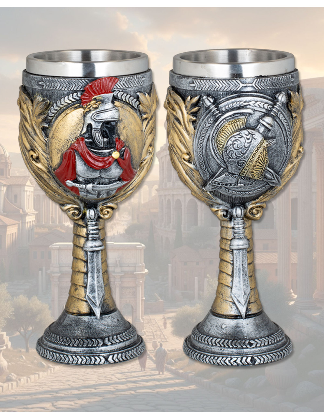 Os motivos em relevo, com bustos de guerreiros, capacetes, escudos e louros, contam uma pequena história em cada ângulo. Você verá a penugem vermelha do capacete e o broche dourado que sugerem honra e vitória, enquanto a base, inspirada na forma de uma folha e empunhadura, aporta estabilidade e um detalhe inesperado que desperta conversas.