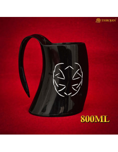 A gravação geométrica feita à mão não é apenas decoração, transforma o chifre em um objeto com presença, cujos relevos oferecem um toque envolvente e uma estética simbólica que remete a tradições nórdicas. O contraste entre o tom escuro do chifre e o design claro na parte frontal potencializa seu impacto visual, perfeito para quem busca se destacar em banquetes, recriações ou encontros temáticos.