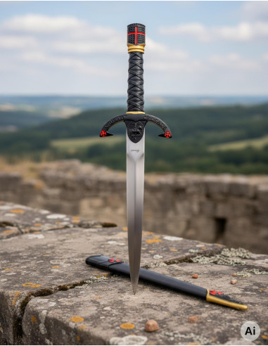A bainha preta com acabamentos em dourado e cruzes vermelhas complementa o design, tornando este punhal uma verdadeira joia que combina simbolismo histórico com arte decorativa. Perfeito para colecionadores, entusiastas de história ou quem deseja adicionar um toque medieval à sua decoração, este punhal de estilo templário é uma peça exclusiva para destacar-se em qualquer espaço.