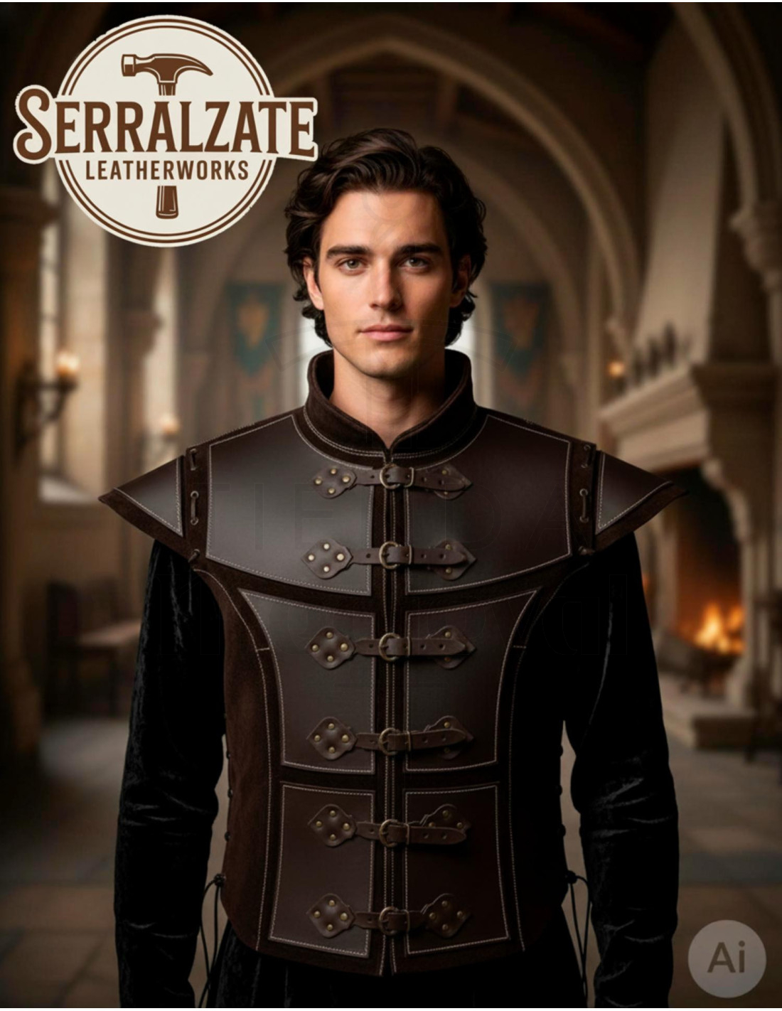 Este jubão transmite presença e autenticidade, pensado para aqueles que valorizam a qualidade e o selo do feito à mão. O couro autêntico oferece uma sensação quente ao toque, adapta-se com o uso e melhora seu caráter ao longo do tempo, portanto levá-lo significa desfrutar de uma peça que ganha personalidade com você. Sendo confeccionado por artesãos de renome na Espanha, cada costura e acabamento reflete cuidado tradicional, garantindo um ajuste confortável e uma silhueta que realça a postura sem sacrificar a mobilidade, ideal para longas jornadas em feiras, filmagens ou recriações.